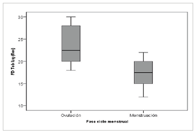 En la Tabla II se presentan los estadísticos descriptivos y las pruebas de rango con signo de Wilcoxon para comparar el rango articular en la pierna izquierda. Los valores de flexión dorsal del tobillo con la rodilla extendida y flexionada, y de extensión de la 1.ª articulación metatarsofalángica son superiores durante la fase de ovulación (Figuras 7 a 9).