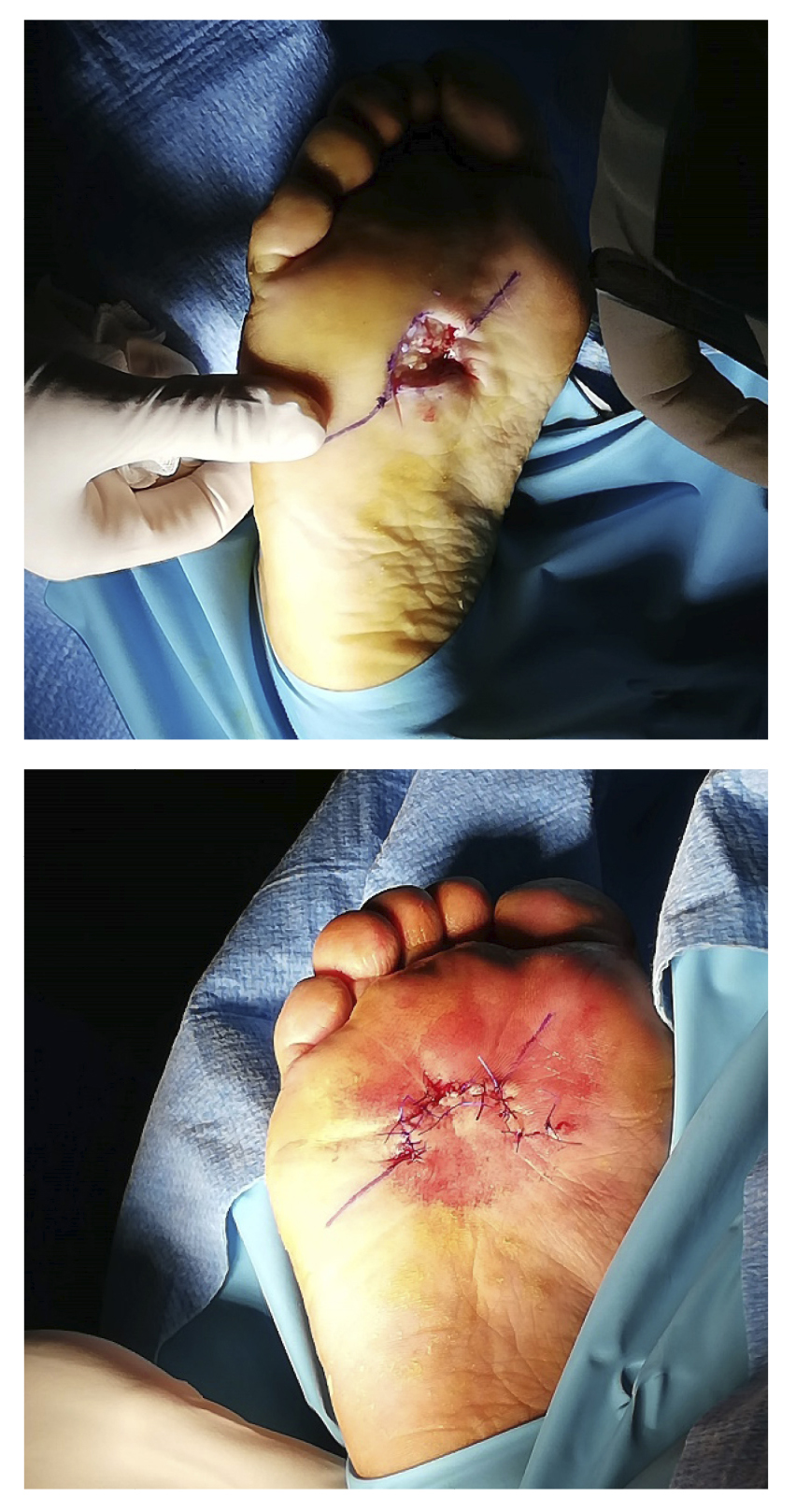 El procedimiento quirúrgico consistió en la resección completa de la lesión, seguida del cierre mediante un colgajo de avance, diseñado considerando el tamaño de la lesión, la tensión cutánea local y las implicaciones biomecánicas en la zona de apoyo, con el objetivo de minimizar complicaciones postoperatorias