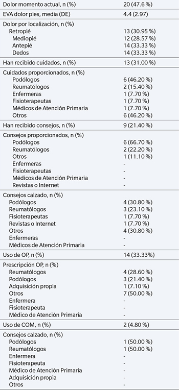 Tabla II. Dolor en los pies, consejos y cuidados recibidos (n = 42).