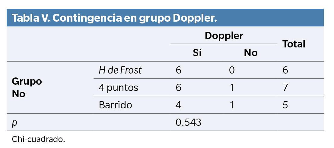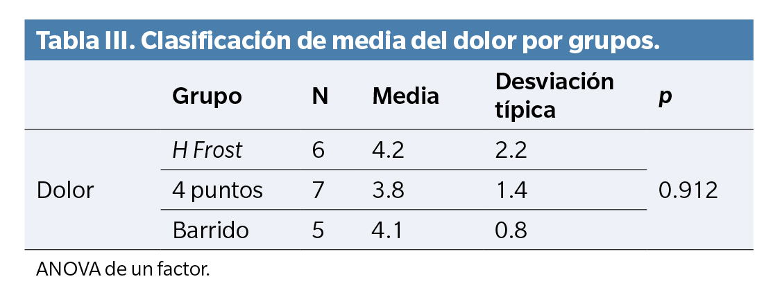 En cuanto a la media del dolor por grupos, en la H de Frost fue de 4.2 + 2.2; de 3.8 + 1.4 en el grupo de 4 puntos y de 4.1 + 0.8 en la técnica de barrido. No hubo diferencias significativas entre grupos (p = 0.912; Tabla 3).