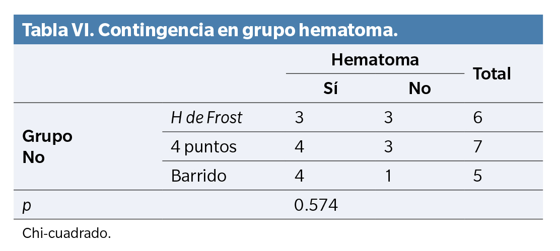 Presencia de hematoma. Se observó hematoma en 7 de los sujetos, de los cuales 3 pertenecieron al grupo de H de Frost, otros 3 sujetos se correspondían con la técnica de 4 puntos, y uno al grupo de barrido, no existiendo diferencias significativas entre los grupos (p = 0.573; Tabla 6).