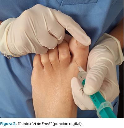 Este proceso anestésico se realiza mediante una punción en la zona lateral y dorsal del dedo, cerca de la comisura interdigital, infiltrando el anestésico de plantar a dorsal. Después, sin extraer la aguja, se lateraliza en la zona dorsal, y se procede a infiltrar el anestésico en dirección medial, pasando bajo el tendón extensor, hasta la zona dorsal medial. Con una segunda punción en esta área dorso-medial, se infiltra de dorsal a plantar. De esta manera el anestésico es depositado en las zonas de paso de los nervios digitales. A esta técnica se le denomina “H de Frost”1. Con esta técnica bloquearemos los 4 troncos nerviosos que inervan el dedo: los 2 nervios digitales dorsales que proceden del nervio peroneo superficial y los 2 nervios plantares, más gruesos, que proceden del nervio tibial posterior4.