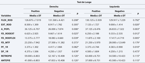 En la comparación realizada entre nadadores con test de Lunge positivo y negativo, las variables que han presentado diferencias estadísticamente significativas son flexión dorsal de tobillo con rodilla flexionada y extendida, extensión de rodilla, ángulo poplíteo y plantarflexión del primer radio, pudiéndose observar, además, diferencias entre extremidad derecha e izquierda (Tabla 4).