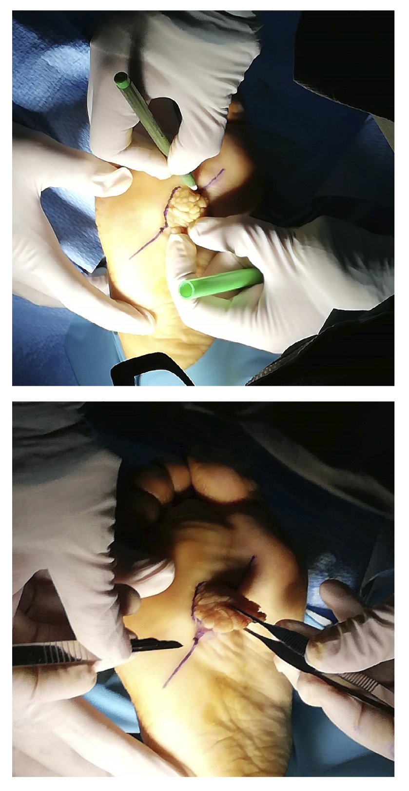 Durante la evaluación clínica, se observó una masa nodular bien delimitada de 4 × 4,5 cm en la región metatarsiana, conectada al segundo espacio intermetatarsiano a través de un pedículo. La lesión no presentaba sensibilidad a la palpación ni signos inflamatorios evidentes. Ante sus dimensiones y características morfológicas, se decidió realizar una escisión quirúrgica programada para diciembre de 2023 bajo anestesia local.