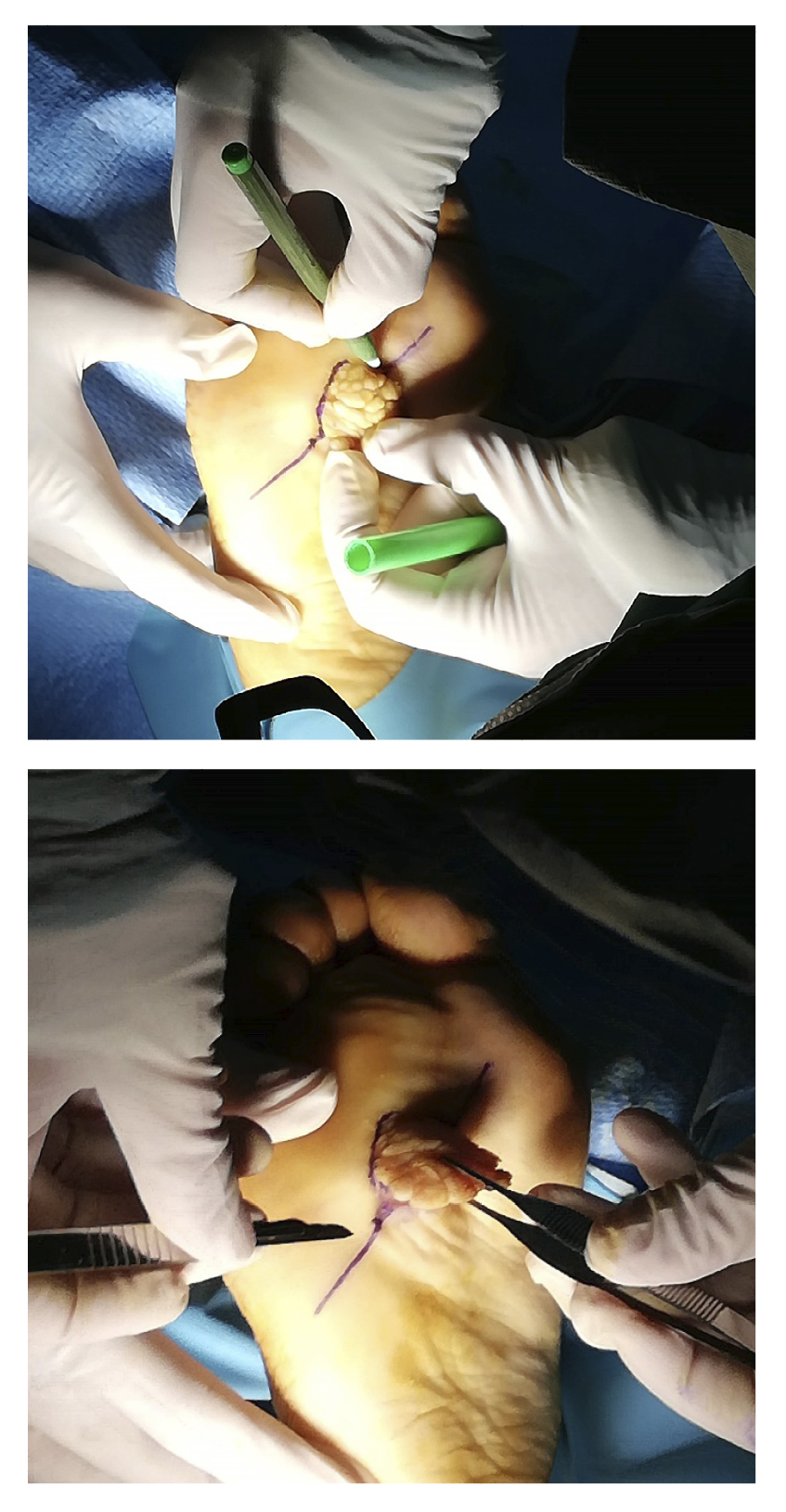 A regional block of the posterior tibial and superficial peroneal nerve was performed with 2% mepivacaine (10 mL). Conscious sedation with 2 mg IV midazolam was administered. Ischemia was achieved with a pneumatic tourniquet at the distal third of the leg, with a pressure of 250 mmHg.