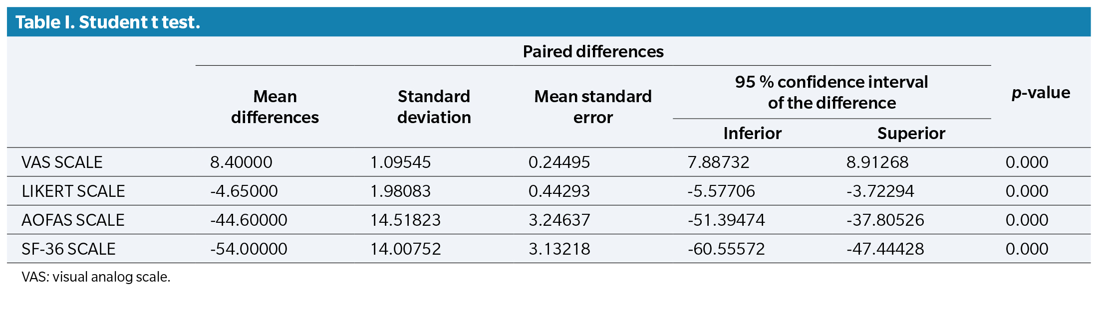 A descriptive analysis of the data was performed. Qualitative variables were expressed as frequencies and their percentage, while the quantitative ones were expressed as mean and standard deviation (SD). A significance test of the null hypothesis was performed using the Student t test for paired samples of the means (preoperative and postoperative) of the scales used in data collection (EVA, Likert, AOFAS, and SF-36).