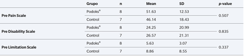 Regarding the differentiation of groups (Podoks® and Control) in the sub-scales of the Foot Function Index (FFI) at baseline, the Podoks® group had a mean score of 51.63 ± 12.53 in the pain scale, while the Control group had a mean score of 46.14 ± 18.43. ­However, no significant difference was found between the results of both groups (p = 0.507) (Table 6). There were also no significant differences in the disability (p = 0.835) or limitation (p = 0.337) sub-scales at baseline.