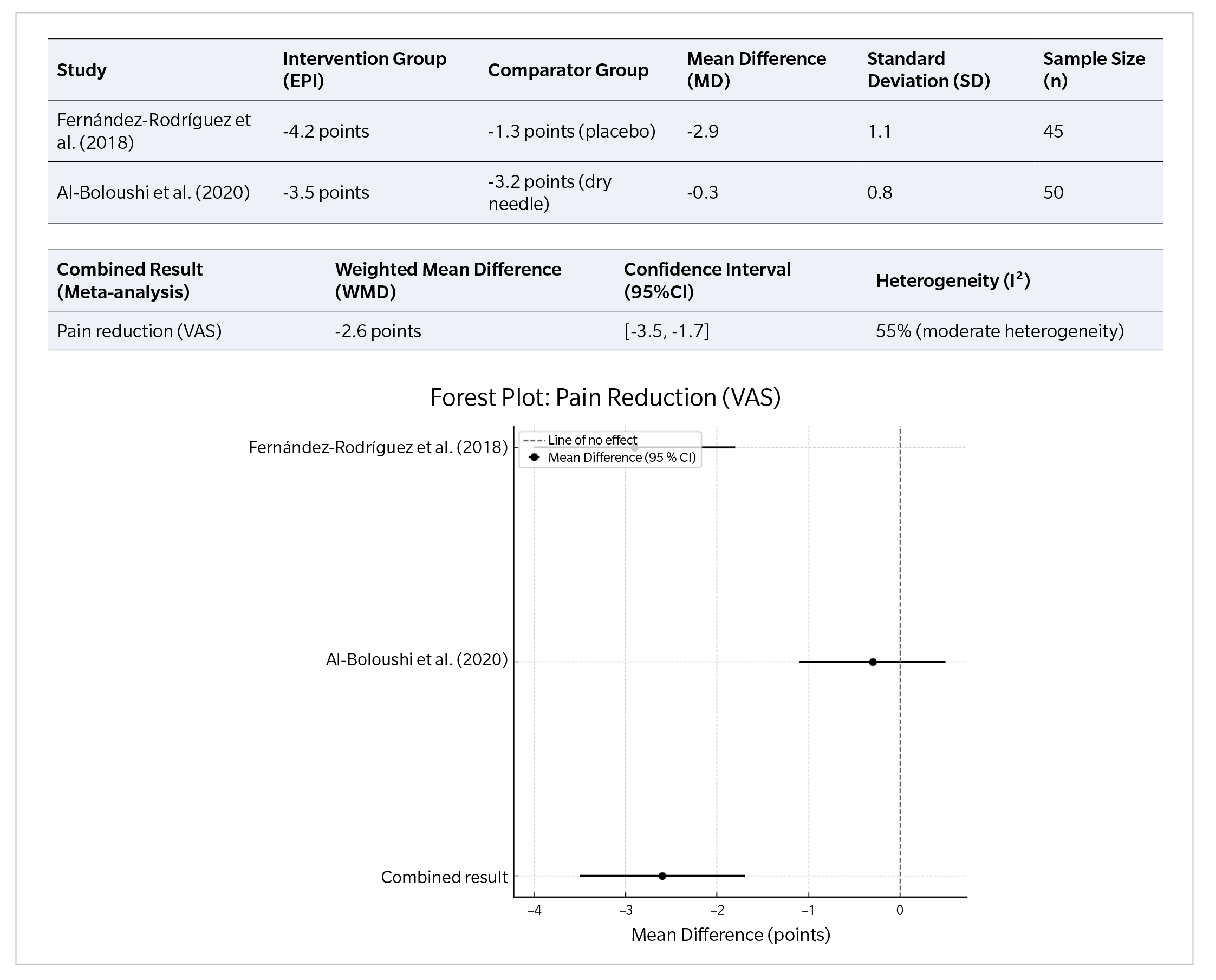 The combined meta-analysis of the three studies (Figure 2) showed a WMD of -2.6 points on the VAS scale in favor of the EPI intervention compared to placebo or superficial dry needling. The results were statistically significant, with a confidence interval (95 %CI) between -3.5 and -1.7. However, moderate heterogeneity was detected between the studies (I² = 55 %), indicating that the variability in the results might be influenced by differences in intervention protocols and the characteristics of the studied populations.