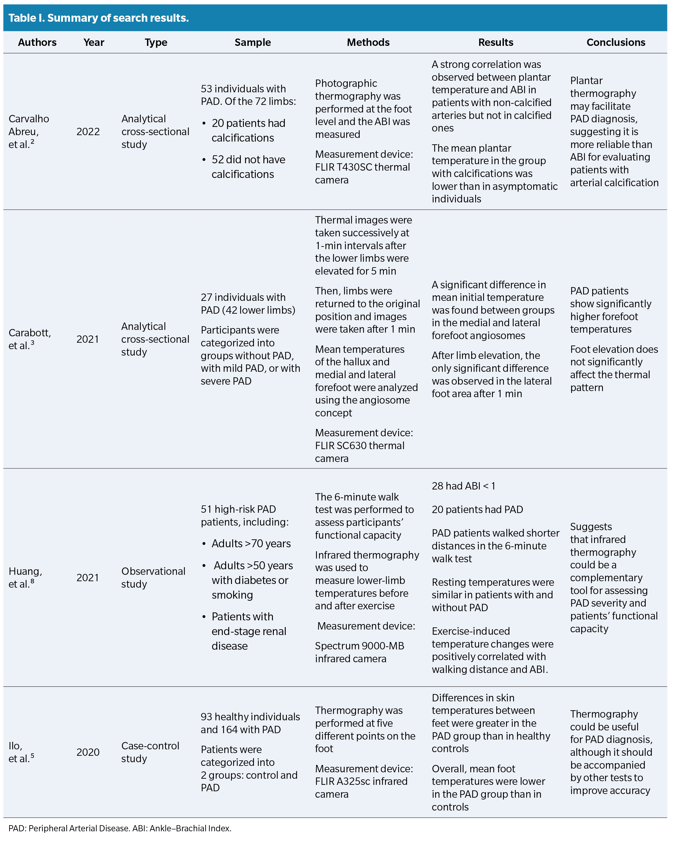 2. de Carvalho Abreu JA, de Oliveira RA, Martin AA. Correlation between ankle-brachial index and thermography measurements in patients with peripheral arterial disease. Vascular. 2022;30(1):88-96. DOI: 10.1177/1708538121996573.