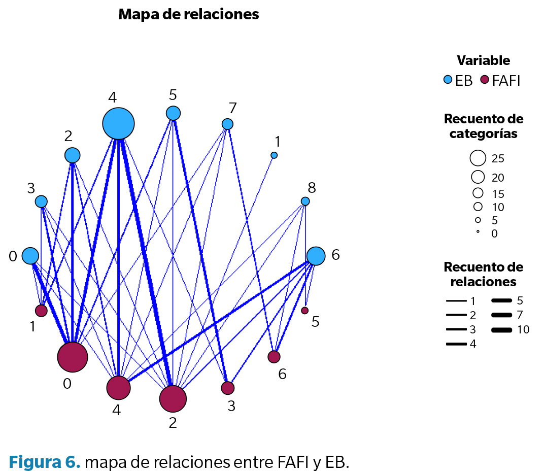 La asociación entre la flexibilidad del pie y tobillo (FAFI) y la hipermovilidad articular (test de Beighton) se puede respaldar también con el mapa de relaciones de la Figura 6 en el que se muestra cómo ciertos niveles de una variable tienden a estar vinculados con valores específicos de la otra.