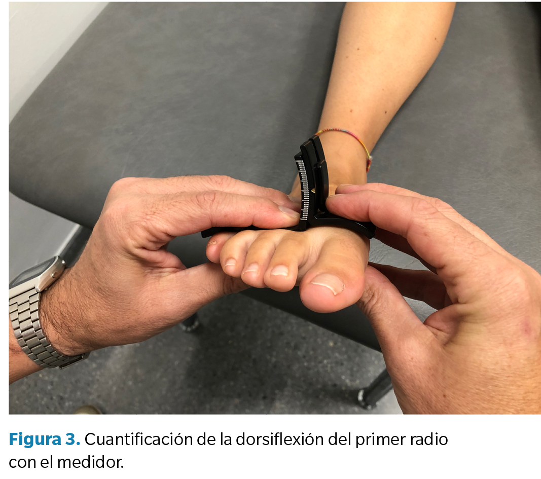 Para cada participante se cumplimentó una hoja con datos sociodemográficos y antecedentes de salud. Se llevó a cabo una exploración del pie en la que se cuantificó la flexión dorsal de la primera articulación metatarsofalángica, la flexión dorsal del tobillo y la dorsiflexión (DF), plantarflexión (PF) y movilidad total del primer radio. Todas esas mediciones fueron realizadas por la misma persona, con más de 7 años de experiencia en exploración del pie.