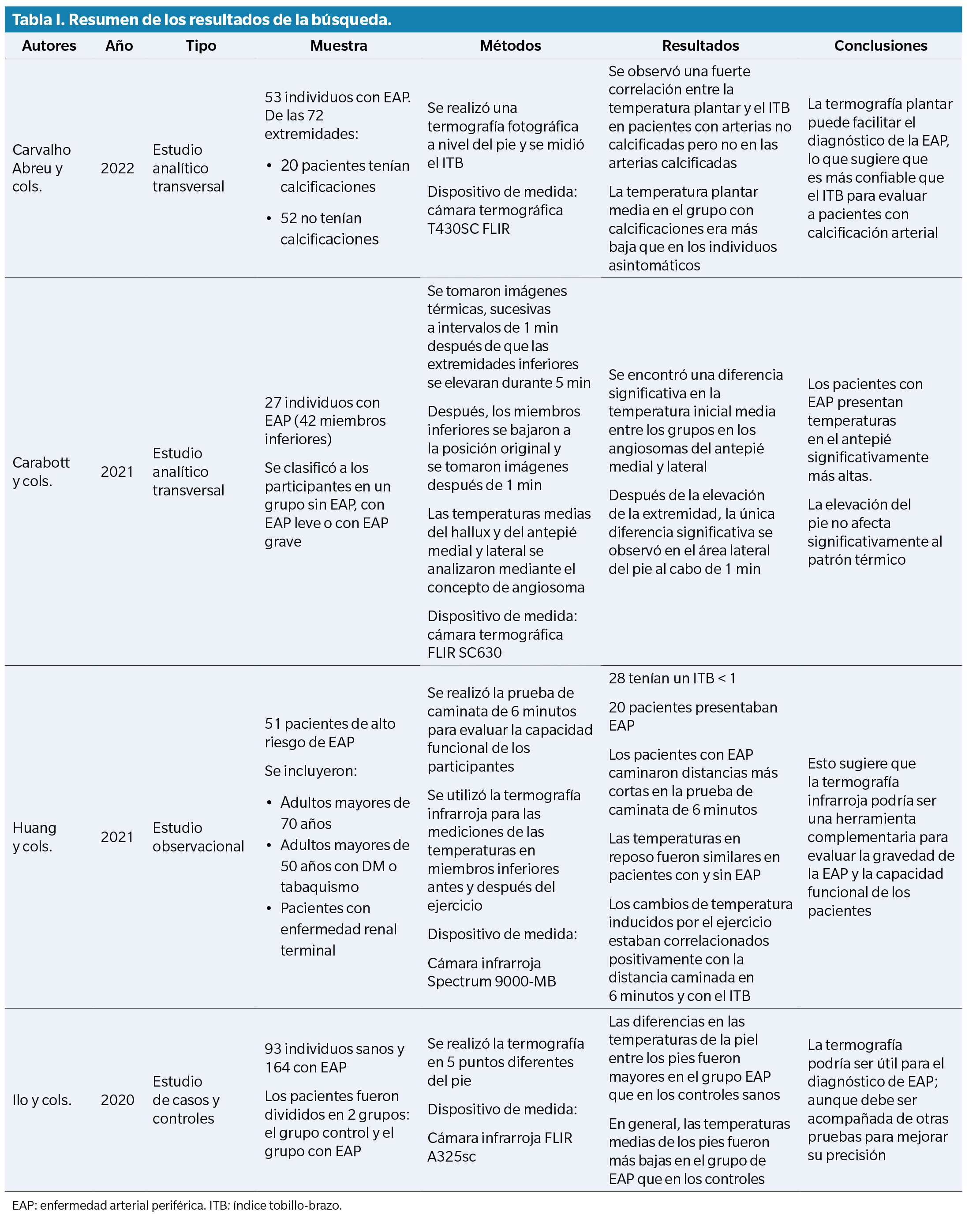 Se ha demostrado que las temperaturas medias de los pies son más bajas en el grupo con EAP que en los controles sanos. Diferencias de temperatura de la piel superiores a 2.2 °C entre los pies son mayores en el grupo de pacientes con EAP que en los controles sanos, por lo que una asimetría térmica significativa podría indicar un proceso patológico. Sin embargo, pese a sus ventajas, la evidencia disponible sobre el uso de la termografía en la EAP continúa siendo heterogénea y dispersa, lo que dificulta establecer conclusiones firmes sobre su aplicabilidad clínica(5,9,10). En este contexto, resulta pertinente sintetizar y analizar la literatura existente.