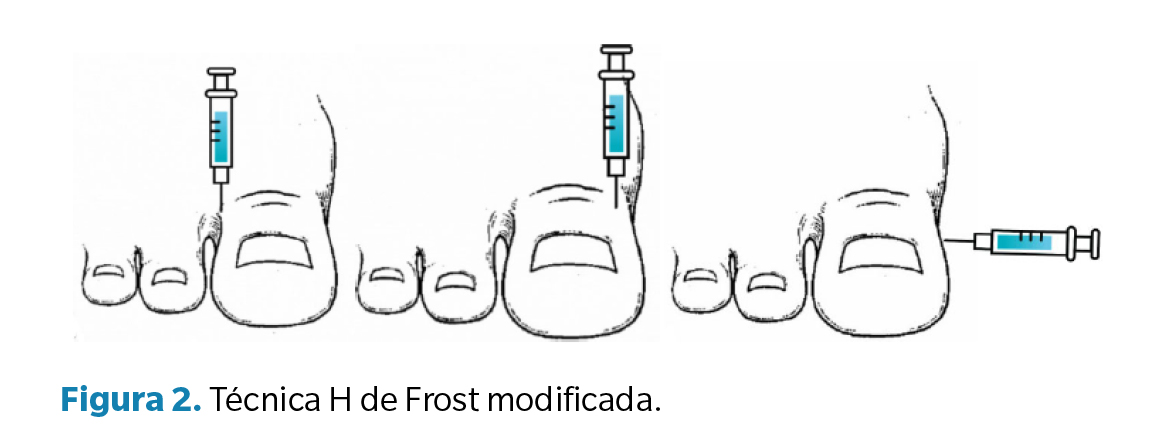 • Técnica H de Frost modificada (Figura 2): se realizan 3 punciones a 90° respecto al eje del dedo. En primer lugar, se efectúa una punción en la base lateral del dedo, depositando un habón anestésico en la región plantar y creando un cordón de anestesia hacia la zona dorsal. A continuación, se realiza una segunda punción en la base medial del dedo, donde se deja un habón anestésico plantar y se completa el cordón anestésico hacia la región dorsal. Finalmente, se lleva a cabo una tercera punción a nivel de la base plantar medial del dedo, depositando un cordón anestésico desde plantar-lateral a plantar-medial(12).
