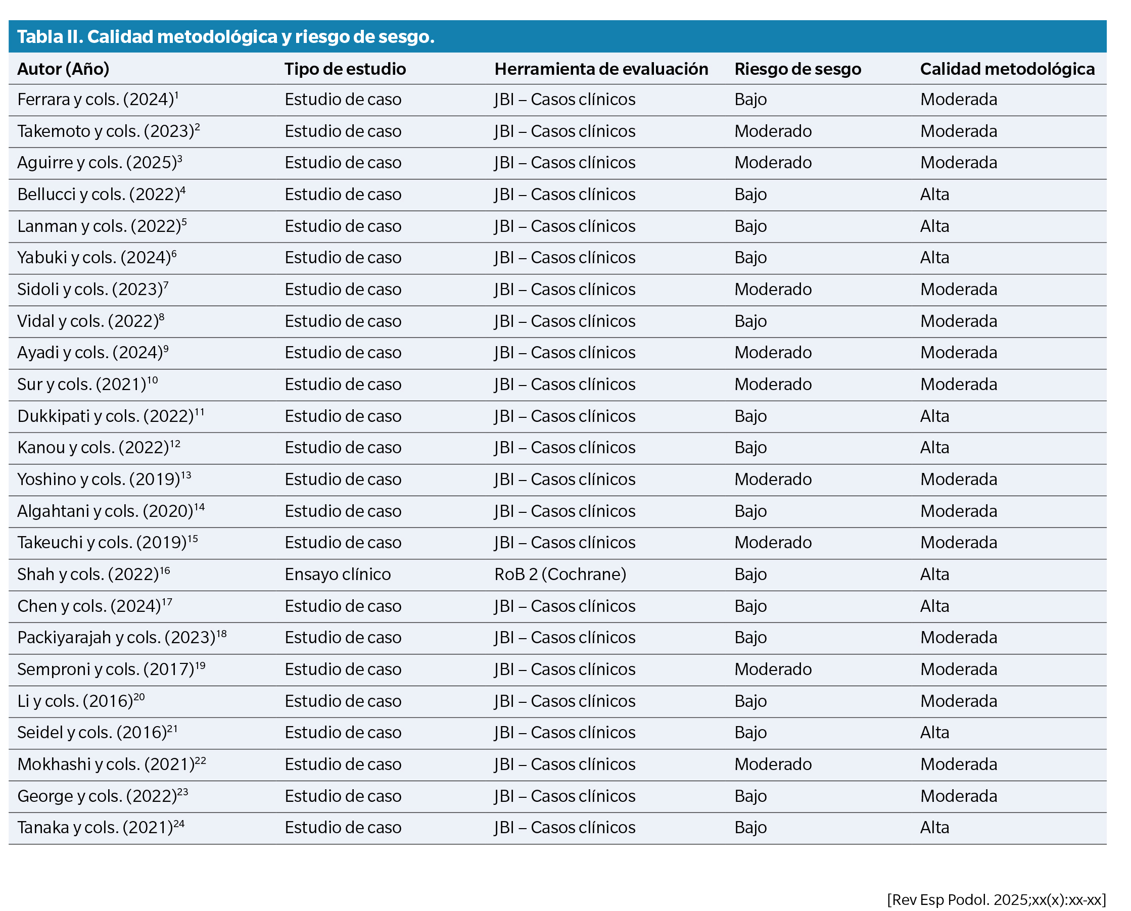 Se aplicaron las herramientas metodológicas JBI y RoB-2 según el diseño de cada estudio. Los resultados se resumen en la Tabla 2 y en la Figura 1.
