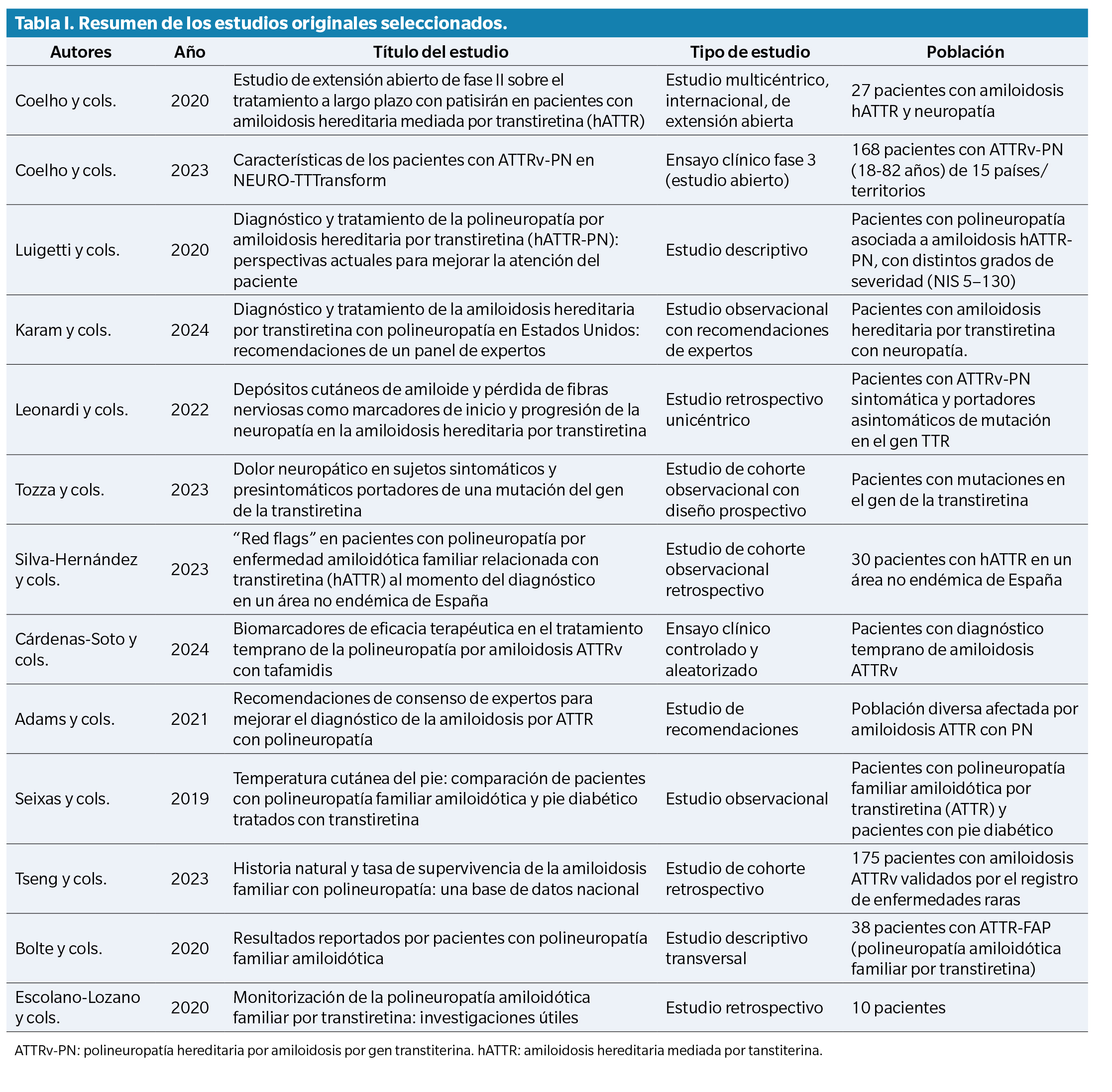 15. Silva-Hernández L, Horga Hernández A, Valls Carbó A, Guerrero Sola A, Montalvo-Moraleda MT, Galán Dávila L. Red flags in patients with hereditary transthyretin amyloidosis at diagnosis in a non-endemic area of Spain. Neurology (Eng Ed). 2023;38(2):87-92. DOI: 10.1016/j.nrl.2020.06.009.