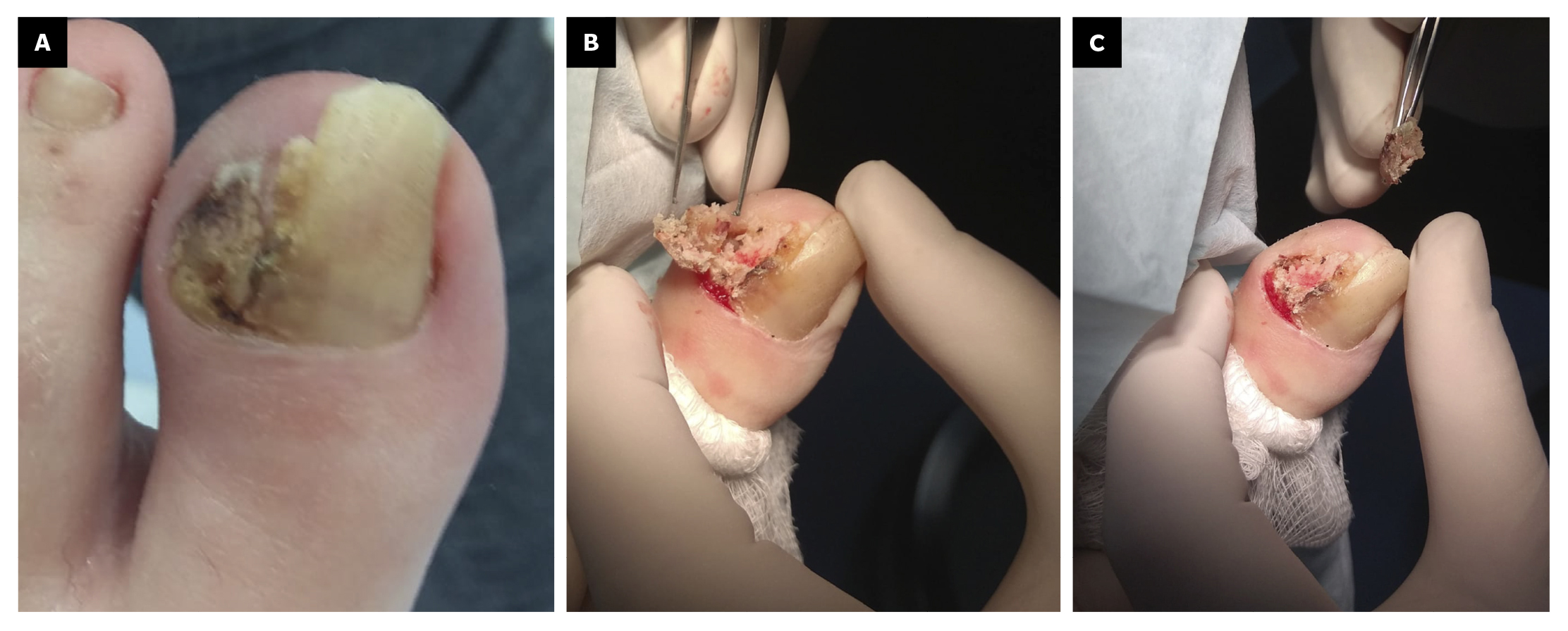 Tras empeoramiento del cuadro clínico, el 14 de noviembre de 2022 se realiza en su centro de salud la retirada parcial de la placa ungueal lateral del pie izquierdo junto con raspado, retirando tejido hiperqueratósico y de granulación. El procedimiento es repetido 48 h más tarde (16 de noviembre de 2022) por no haber retirado toda la lesión (Figura 3), cambiando el tratamiento antibiótico a anaclosil 500 mg 1/6 h y posteriormente a ciprofloxacino 500 mg 1/12 h durante las siguientes semanas.