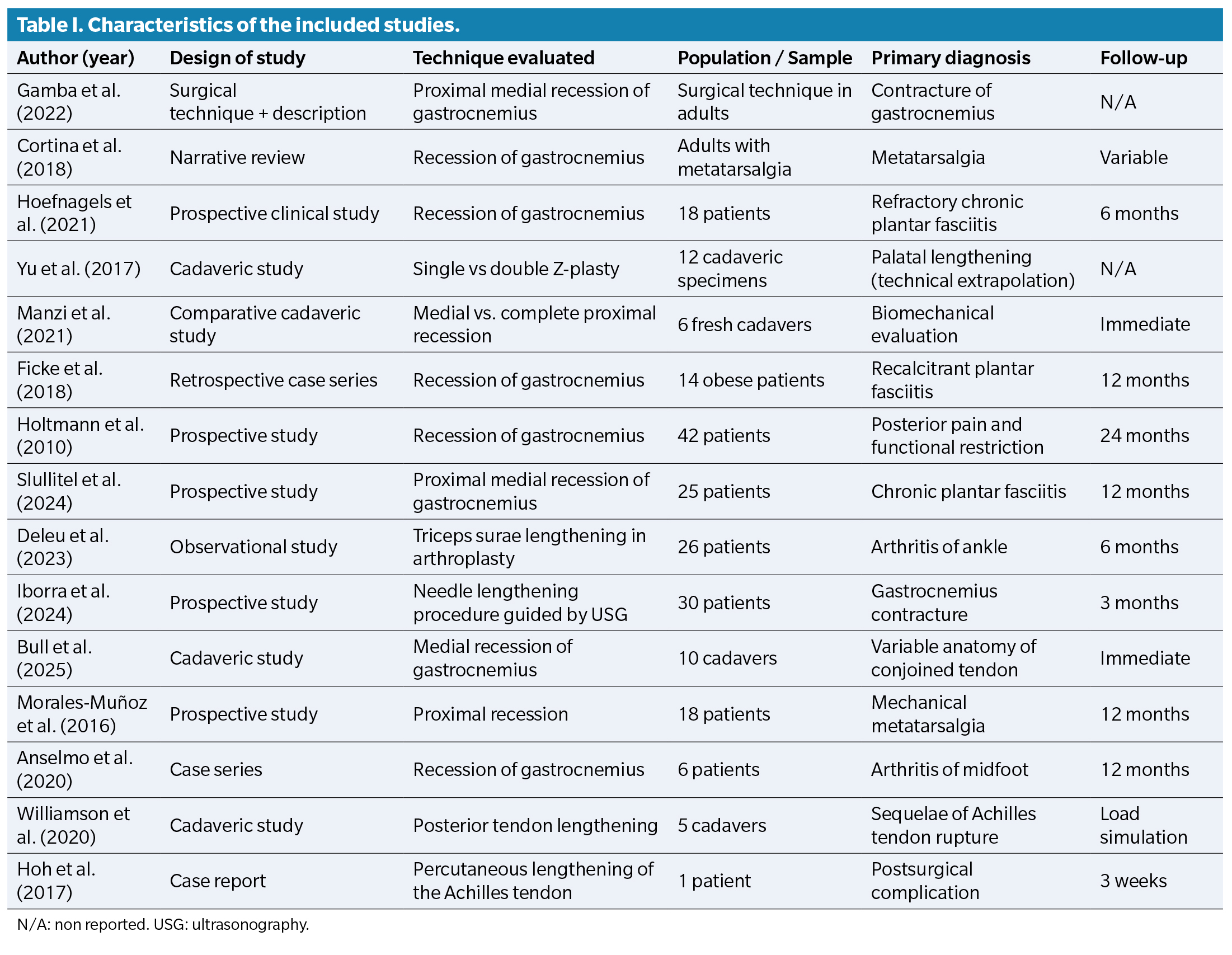 Material and methods: A systematic review of scientific articles published up to 2024 was conducted, selecting those that evaluated the clinical, functional, and surgical outcomes of posterior leg muscle lengthening techniques. Experimental and clinical studies, as well as reviews that provided quantitative data, were included. In all cases, methodological quality and risk of bias were assessed using tools adapted to the design of each study.