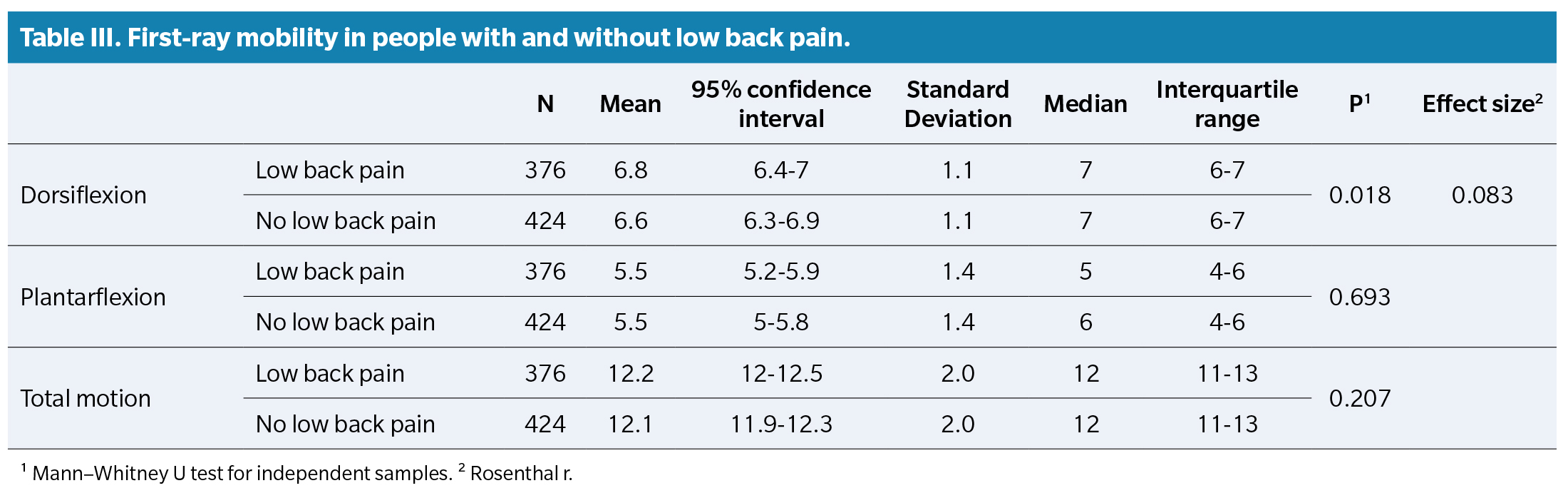 However, when filtering to pain-free participants with normal feet and comparing their first-ray mobility with participants with low back pain and altered-mobility feet, PF showed the largest effect size (though not large by convention) and was lower in the low-back-pain group (Table 4). Thus, while differences were statistically significant, they should be interpreted cautiously in clinical terms.