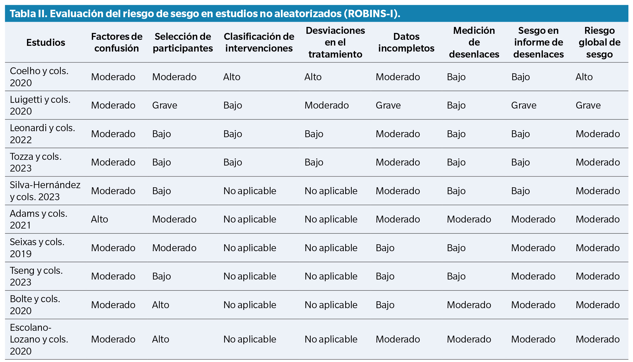 La evaluación del riesgo de sesgo se realizó utilizando 2 herramientas: ROBINS-I para los estudios no aleatorizados (Tabla 2) y RoB 2 para los estudios aleatorizados (Tabla 3).