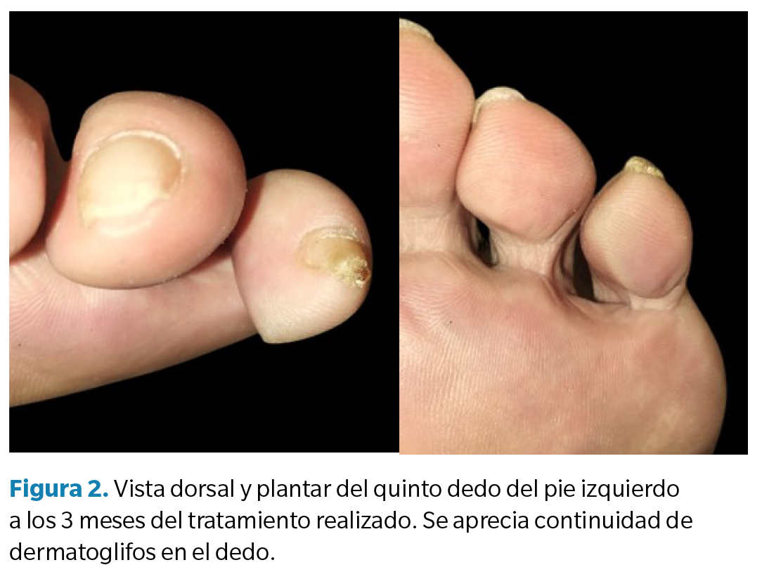 Se indicó al paciente realizar curas diarias domiciliarias con sulfadiazina de plata en suspensión para pulverización cutánea (Silvederma®, Laboratorio Aldo-Unión SL, España) por un periodo de 2 semanas. La muestra enviada al laboratorio concluyó que se trataba de una verruga vírica. La descripción microscópica señaló: “Secciones de piel mostrando hiperqueratosis severa en superficie con columnas paraqueratósicas. La epidermis mostró acantosis con marcada papilomatosis, hipergranulosis y vacuolas perinucleares en los queratinocitos del estrato de Malpighi”. Tres meses después de la intervención, se realizó una visita control donde no se observó lesión (Figura 2). Posteriormente se citó al paciente a los 12 meses para control, donde no se apreció verruga, pudiéndose observar los dermatoglifos del quinto dedo (Figura 3).