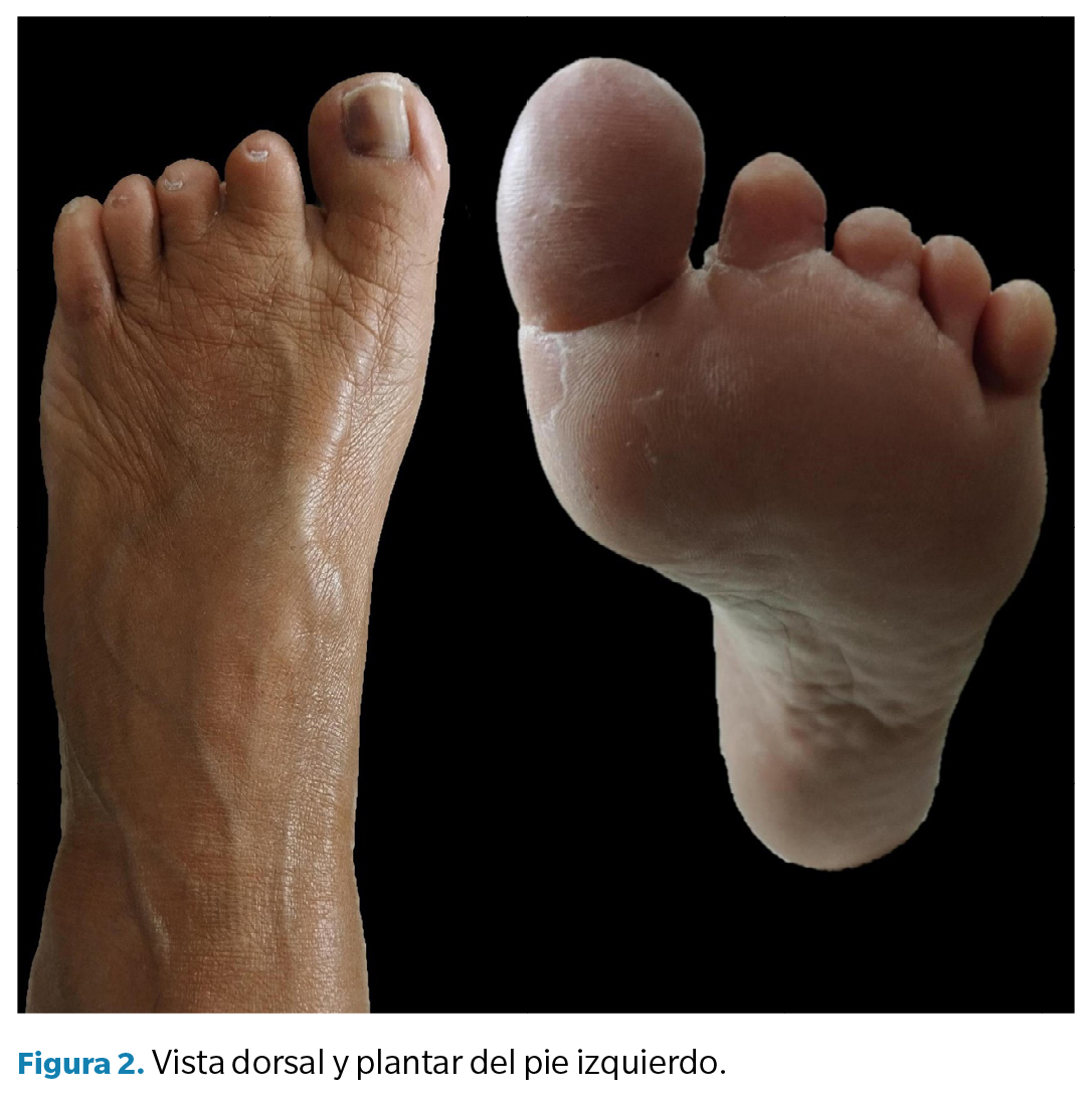 Presentamos el caso de una mujer caucásica de 62 años que acudió a consulta por presentar hematoma subungueal en ambos primeros dedos del pie. Al realizar la exploración física, se halló que presentaba hipoplasia del segundo, tercer y cuarto dedos del pie izquierdo y microniquia, sin presentar queratosis a nivel plantar (Figura 1).
