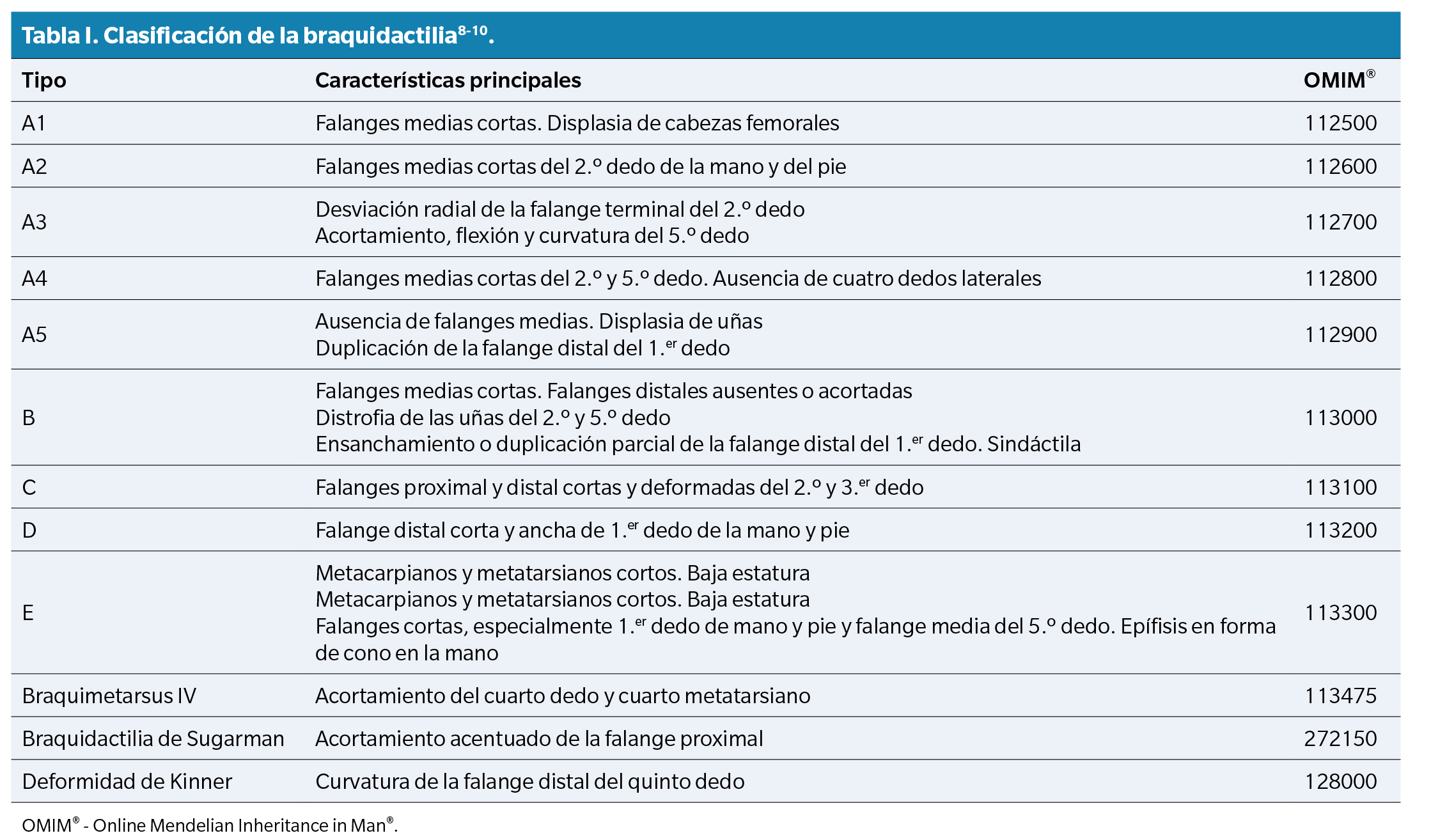 Diferentes anomalías, tales como sinfalangismo, sindactilia o la desviación digital, son características de presentar BD, pudiendo ser reconocida en el nacimiento o en la niñez después de un fallo de la osificación de componentes digitales. Se pueden distinguir diferentes tipos de BD según criterios anatómicos y patrones radiológicos(3), la mayoría de los tipos son raros exceptuando la BD tipo A3 y BD tipo D, que tienen una prevalencia de alrededor del 2 %(6,7) (Tabla 1). Este artículo se enfoca en la BD tipo B (BDB; ONIM # 113000) (11).