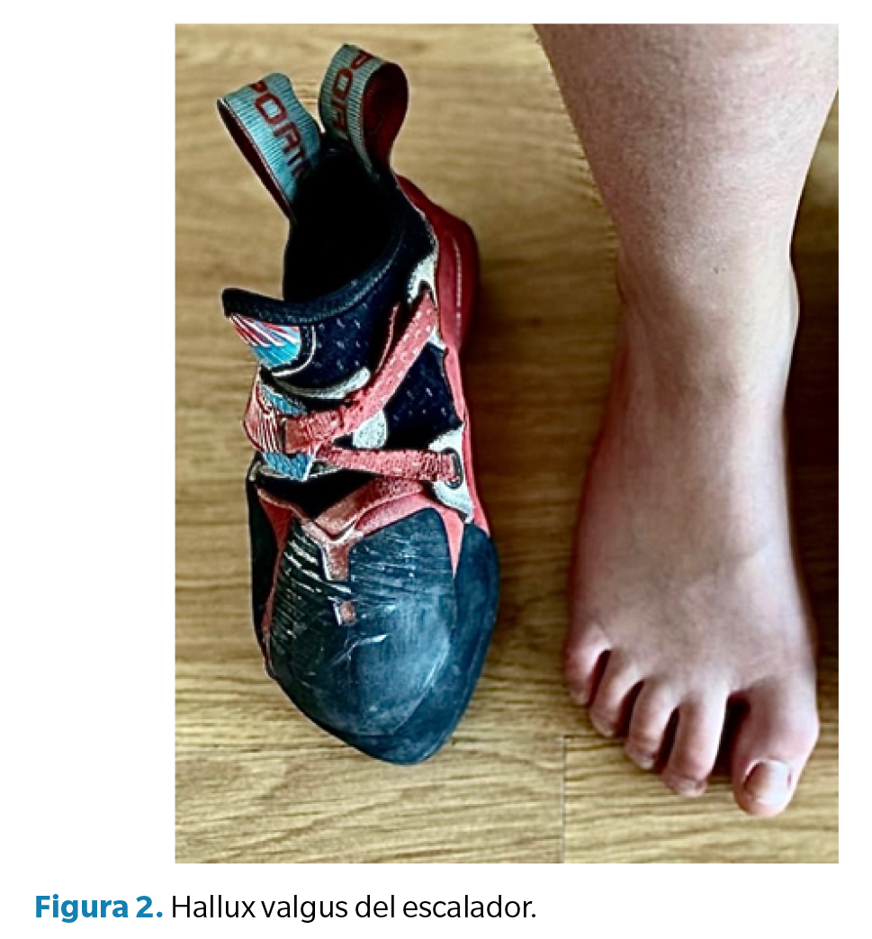 La literatura sobre el pie del escalador señala que la mayoría ha sufrido algún dolor o deformidad durante la práctica de este deporte, ya sea en el pie o en el tobillo(10,11,12,). Las deformidades y lesiones más comunes son: deformidades digitales, hallux limitus, hematoma subungueal y hallux valgus (Figura 2) (11). Aunque un pie de gato bien ajustado puede ayudar biomecánicamente a prevenir trastornos crónicos, la talla cobra especial relevancia. El diseño busca un ajuste “de segunda piel” y, para lograrlo, muchos escaladores aceptan dolor durante y después de escalar(10,11,12). Se ha descrito el uso de pies de gato extremadamente ceñidos, incluso hasta 4 tallas por debajo de la talla real(10).