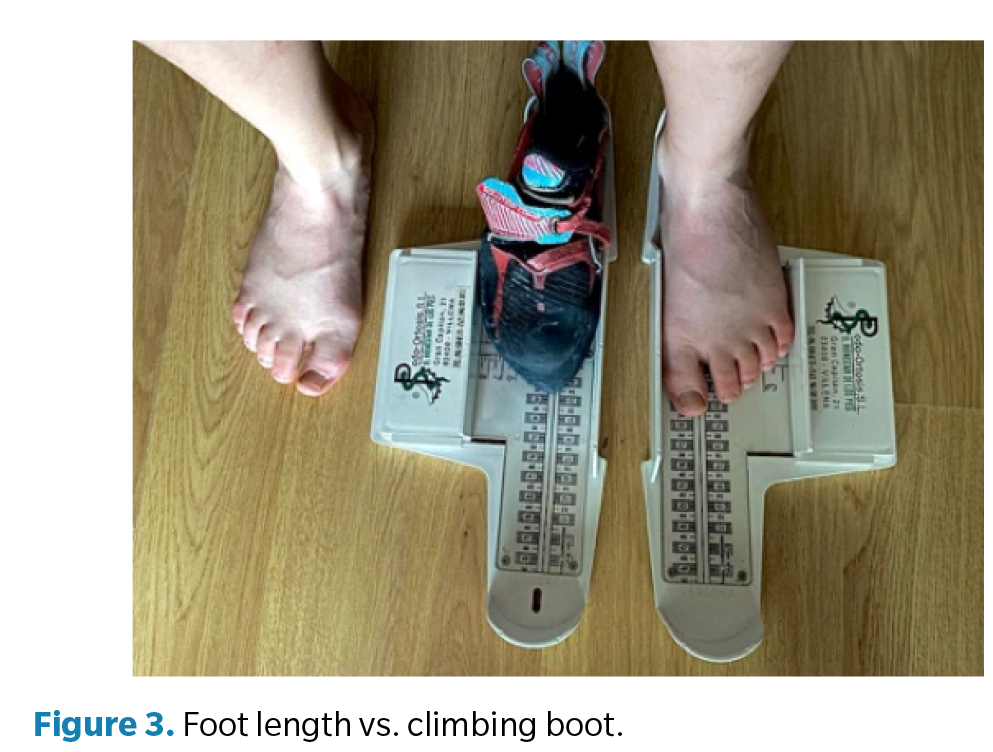 Most climbing-related foot injuries are due to the use of unnatural shaped climbing shoes or(7,8)shoes that are too small. Plantar flexion of the metatarsal heads causes a tightening of the plantar fascia(8,9). High-performance athletes who practice climbing suffer more foot deformities and injuries than lower-performance climbers due to the habitual practice of using climbing shoes that are smaller than normal street shoe sizes1(12,13). Authors such as Schöffl have already reported an average difference of two centimeters between the length of the climber’s foot and the length of the “climbing shoe” normally used(20). In addition, between 80 and 90 % of climbers reported foot pain during sports practice associated with the use of “climbing shoes.” However, they accept this discomfort in order to improve their performance(28).