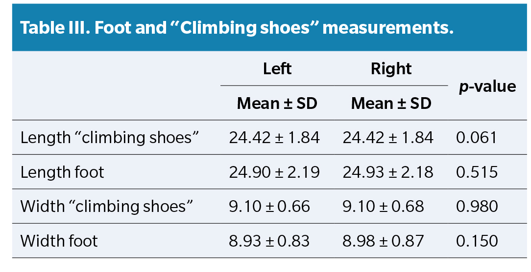 Results: Seventy percent of the climbers used shoes shorter than their feet, with a significant difference between foot length and shoe length. When relating the number of years of climbing experience with the occurrence of injuries, a significant difference was also observed (p-value < 0.05), the most common injuries were HAV, Hallux Limitus, Hyperkeratosis, representing 60 % with such injuries.
