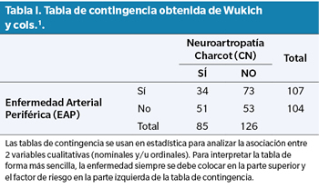 Hemos creado una tabla de contingencia de 2 x 2 según los datos del estudio transversal de Wukich y cols. en 20161, que midió la presencia de enfermedad arterial periférica (EAP) en pacientes diabéticos con neuroartropatía de Charcot (NC) y en pacientes diabéticos sin neuroartropatía de Charcot (Tabla I). La idea del estudio es saber hasta qué punto estas enfermedades están relacionadas y existe una asociación entre la EAP y la NC. La probabilidad de que un paciente con NC tenga EAP es de 34/107 = 0.32; es decir un 32 %. La probabilidad de que un paciente con NC no tenga EAP es de 51/104 = 0.49; es decir un 49 %. El riesgo relativo se calcula dividendo la probabilidad de presentar la enfermedad (NC) en pacientes con EAP entre la probabilidad de presentar la enfermedad (NC) en pacientes sin EAP (riesgo relativo = 0.32/0.49 = 0.65).