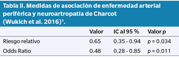 Como con cualquiera de otros estadísticos se puede calcular también un intervalo de confianza (IC) del riesgo relativo y del odds ratio, lo que nos da una idea del valor p de los mismos (Tabla II). En el estudio de Wukich y cols. el riesgo relativo de la asociación entre EAP y NC tiene un valor de 0.65 con un IC al 95 % que va desde 0.35 a 0.94 y el odds ratio tiene un valor de 0.48 con un IC al 95 % que va desde 0.28 a 0.85. En ambos casos, el IC al 95 % no cruza el valor 1 por lo que los resultados son estadísticamente significativos para un contraste de hipótesis con un nivel de significación del 5 % (p = 0.05). Si los intervalos de confianza al 95 % hubieran englobado el valor 1 el valor p hubiera sido superior a 0.05, lo que en un test de contraste de hipótesis se consideraría como un valor no estadísticamente significativo.