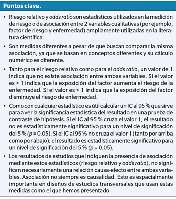 Las medidas de asociación o efecto son una forma de presentar la relación existente entre un factor de exposición o de riesgo y una enfermedad. Las medidas de asociación que se pueden utilizar van en función del tipo de estudio epidemiológico concreto, aunque las más utilizadas son el riesgo relativo y el odds ratio, que son las que veremos en esta y en la siguiente carta de esta sección. Existe un problema crónico con estos términos y es que se confunden o se usan de forma intercambiable cuando en realidad no lo son. A pesar de que odds ratio aparece de forma continua en artículos científicos de forma cada vez más habitual, no existe una traducción aceptada del término al castellano. Se ha traducido como razón de productos cruzados, razón de ventajas, razón de momios, desigualdad relativa u oportunidad relativa entre otros.