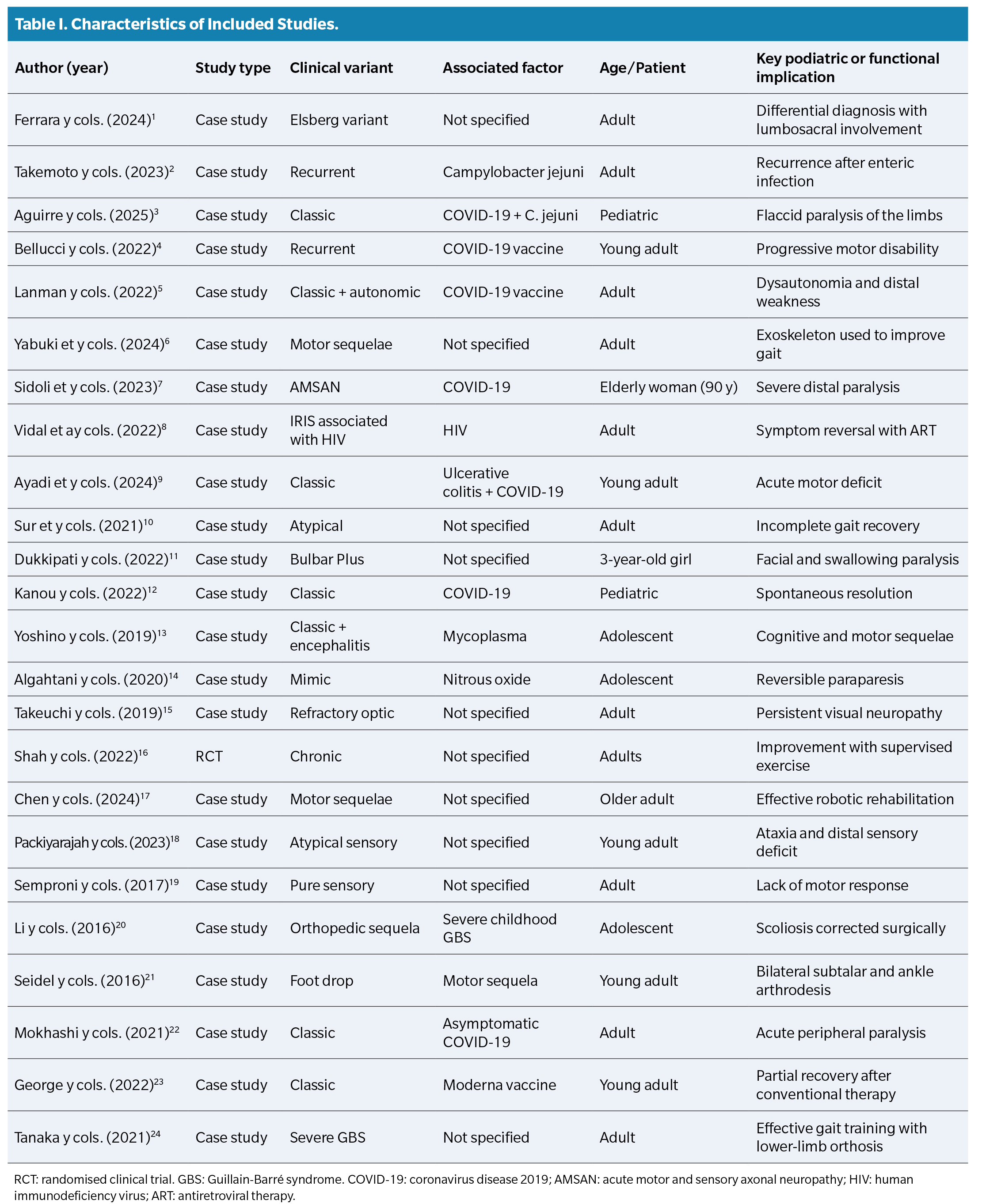 In all included studies, the GBS diagnosis was established clinically and neurologically, confirmed by complementary tests (electromyography, lumbar puncture, or neuroimaging). Most publications described subacute or chronic GBS cases with predominantly distal neuromuscular sequelae.
