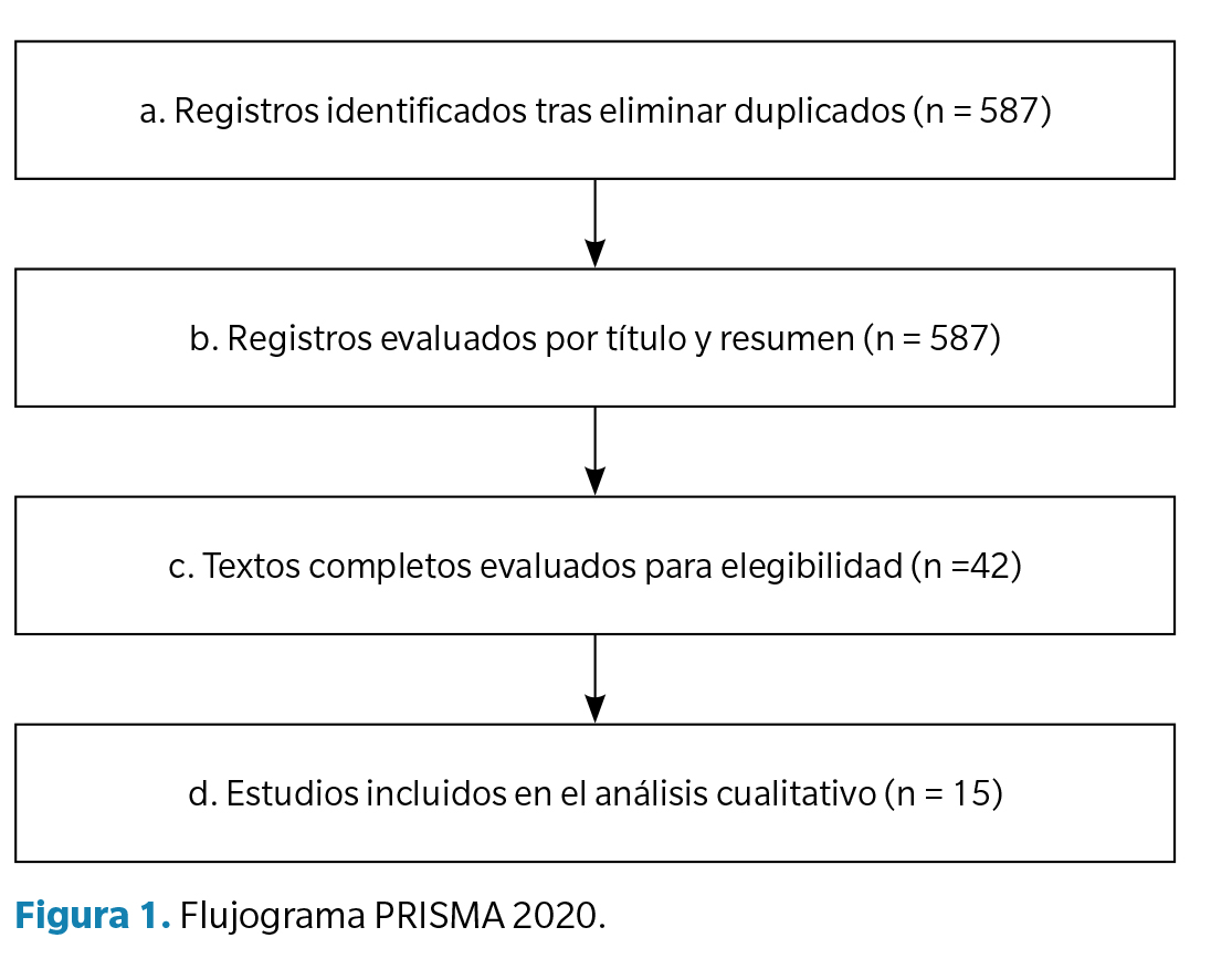 La búsqueda sistemática identificó inicialmente 587 registros tras eliminar duplicados. Después de la evaluación por título y resumen, se seleccionaron 42 estudios para revisión a texto completo. Finalmente, 15 estudios (Tabla 1) cumplieron con los criterios de inclusión y fueron incluidos en el análisis cualitativo. El proceso de selección se detalla en el diagrama de flujo PRISMA 2020 (Figura 1).