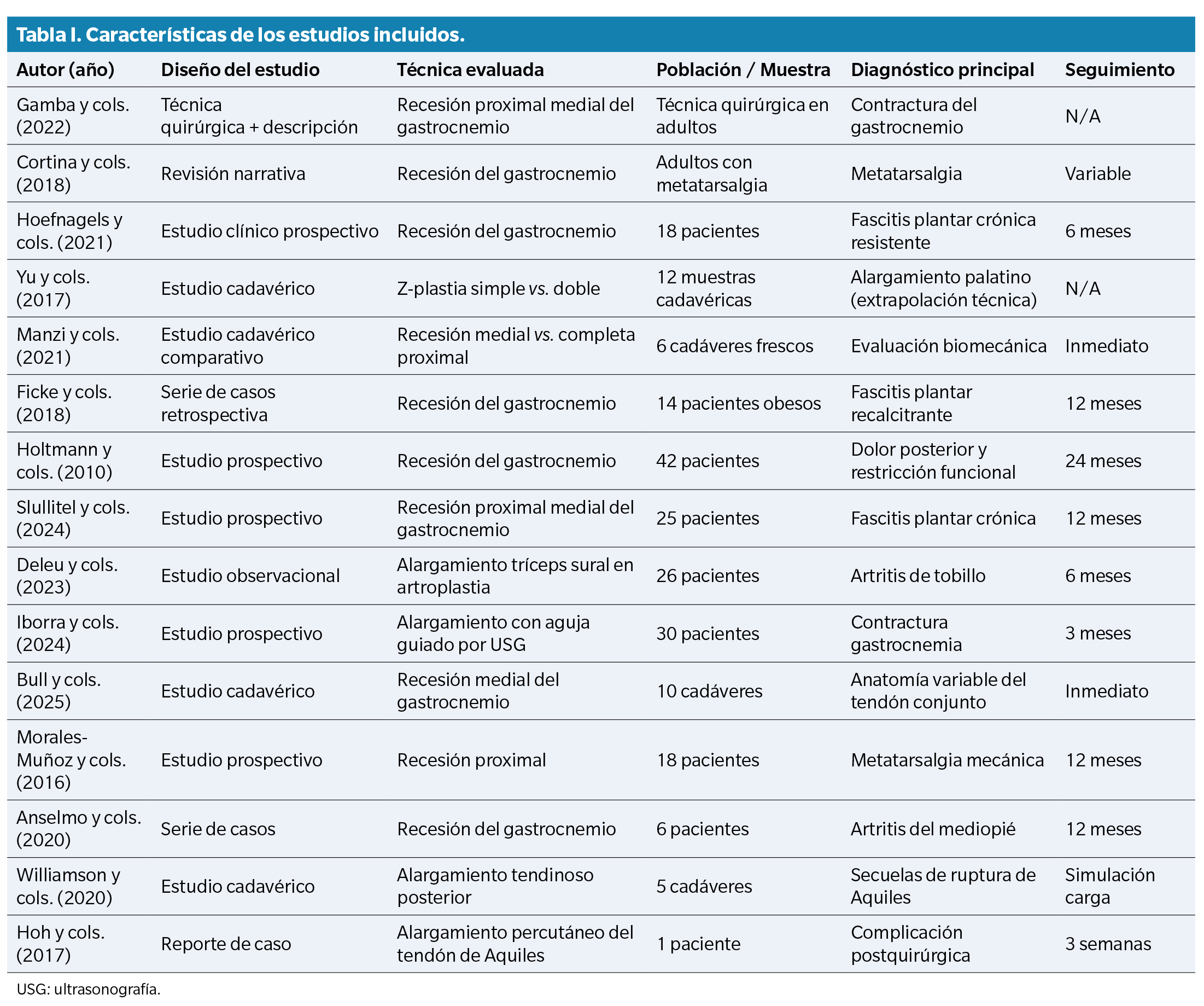 Los estudios incluidos (Tabla 2) fueron publicados entre 2016 y 2025, con diseños variados que incluyeron ensayos clínicos, estudios de cohorte, estudios observacionales retrospectivos, estudios cadavéricos y estudios de casos clínicos. La población incluyó pacientes con diagnósticos como fascitis plantar resistente, metatarsalgia, contractura del gastrocnemio, artritis del mediopié y secuelas posruptura del tendón de Aquiles.