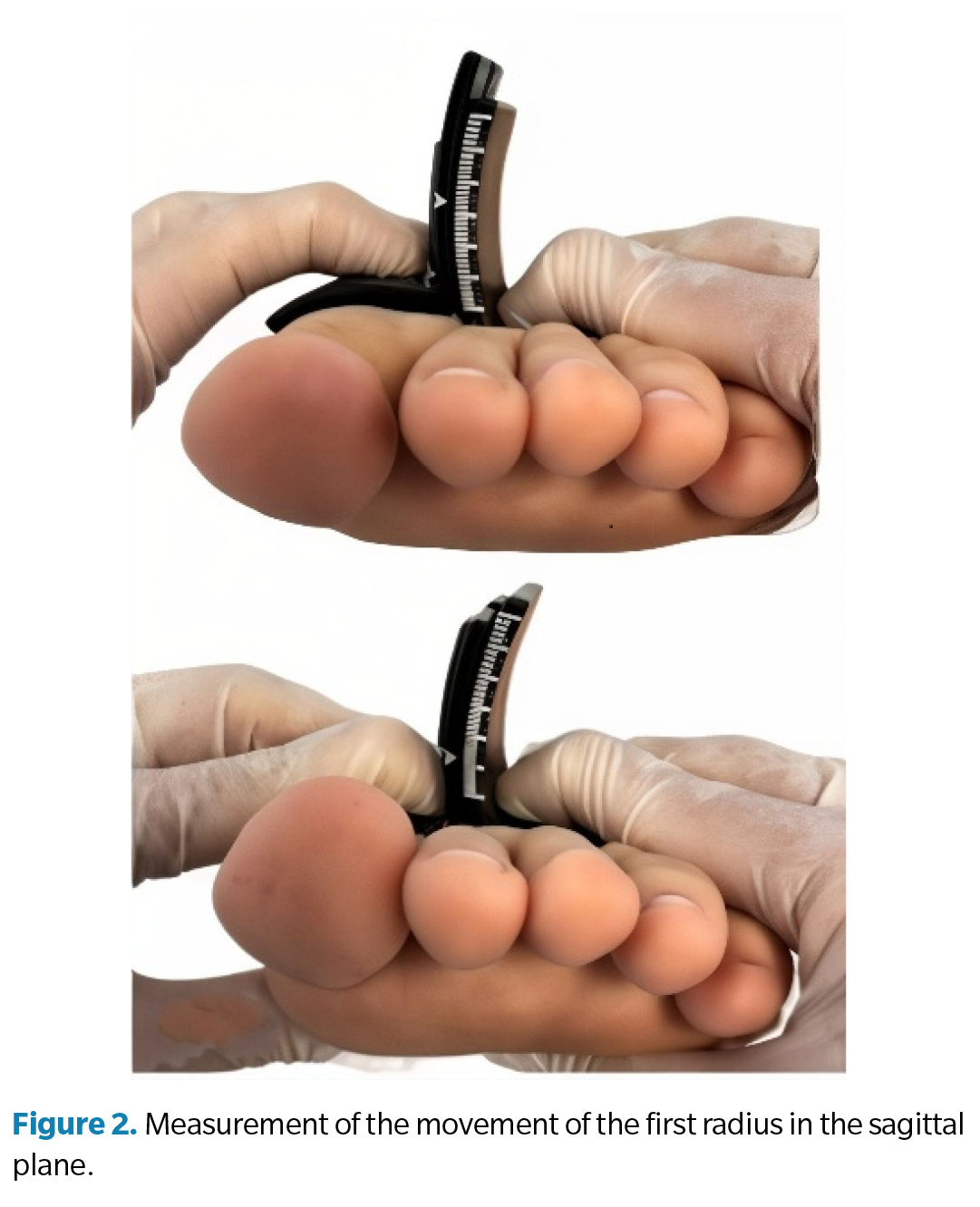 • First-ray mobility: maximum dorsiflexion and plantarflexion range was measured in millimeters with the patient in supine position, ankle relaxed, and subtalar joint in neutral, following previously validated protocols7-9 (Figure 2).