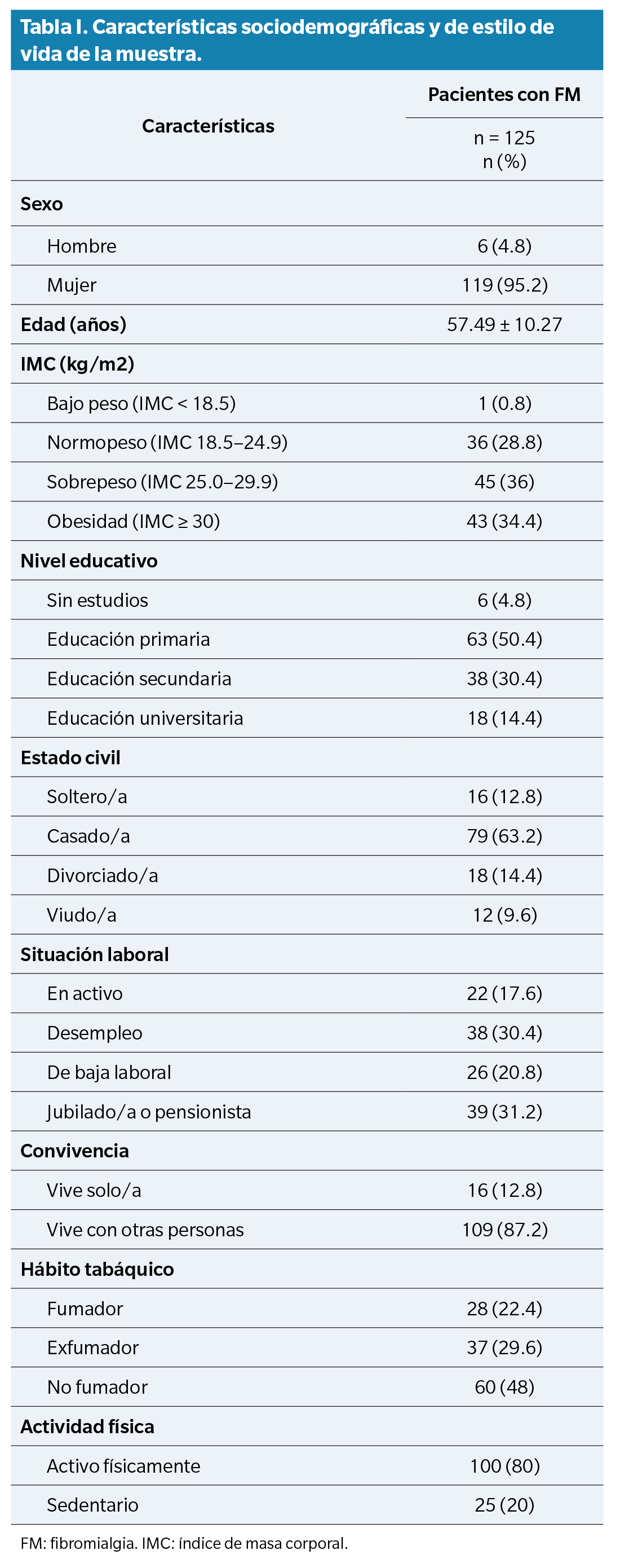 El estudio incluyó a 125 pacientes con diagnóstico de FM, de los cuales el 95.2 % eran mujeres. El IMC promedio fue de 27.95 ± 5.48 kg/m² (Tabla 1). El 20.8 % de los participantes refirió antecedentes familiares de FM. En cuanto a la evolución clínica, el tiempo medio desde la aparición de los primeros síntomas fue de 20.16 ± 12.82 años, mientras que el tiempo transcurrido desde el diagnóstico fue de 11.88 ± 10.09 años. La latencia diagnóstica (tiempo entre el inicio de los síntomas y el diagnóstico) fue, en promedio, de 8.29 ± 8.95 años. La edad media al momento del diagnóstico fue de 45.23 ± 10.04 años. Las comorbilidades más frecuentes fueron la ansiedad (64.8 %), la depresión (57.6 %) y la hipercolesterolemia (40 %).