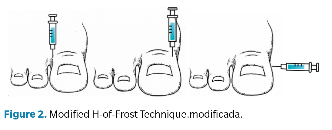 • Modified H-Frost technique (Figure 2): 3 punctures are performed at 90° to the axis of the toe. First, a puncture is performed at the lateral base of the toe, depositing an anesthetic wheal in the plantar region and creating an anesthetic track toward the dorsal area. Then, a 2nd puncture is performed at the medial base of the toe, depositing a plantar anesthetic wheal and completing the dorsal anesthetic track. Finally, a third puncture is carried out at the medial–plantar base of the toe, depositing an anesthetic track from plantar–lateral to plantar–medial¹².