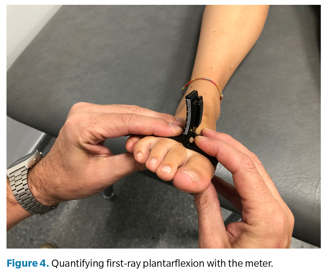 First-ray mobility was measured with the Medidor de Primer Radio® (Fresco Podología SL, Barcelona, Spain), a valid, reliable instrument used in previous studies (Figure 1) (7,8,13). For the measurement, one hand maintained the horizontal arm over the heads of the 2nd–5th metatarsals while the other hand positioned the opposite horizontal arm vs the head of the 1st metatarsal. From this position, the 1st metatarsal head and horizontal arm were moved upward to read dorsiflexion (mm) on the vertical arm and downward to read plantarflexion (Figure 2, Figure 3, Figure 4) (7,8). Each foot was measured three times; the mean was used for analysis.