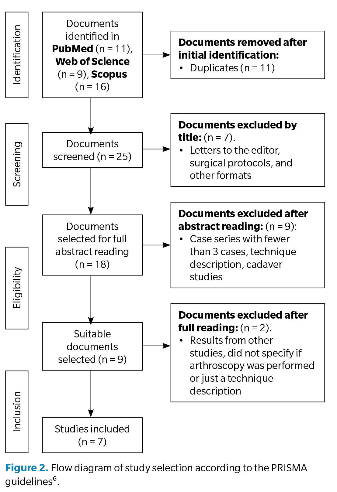 Searches were conducted in PubMed, WOS, and Scopus using pre-established search criteria, obtaining a total of 36 studies. After removing duplicates, 25 studies remained, of which 18 were selected for full abstract review. Nine studies focusing on cadaver techniques or describing the arthroscopic technique and its benefits were excluded. After the first full reading of the studies, two more were excluded for not specifying the use of arthroscopy in the surgical technique or for being technique descriptions. Finally, seven articles were selected for complete analysis.