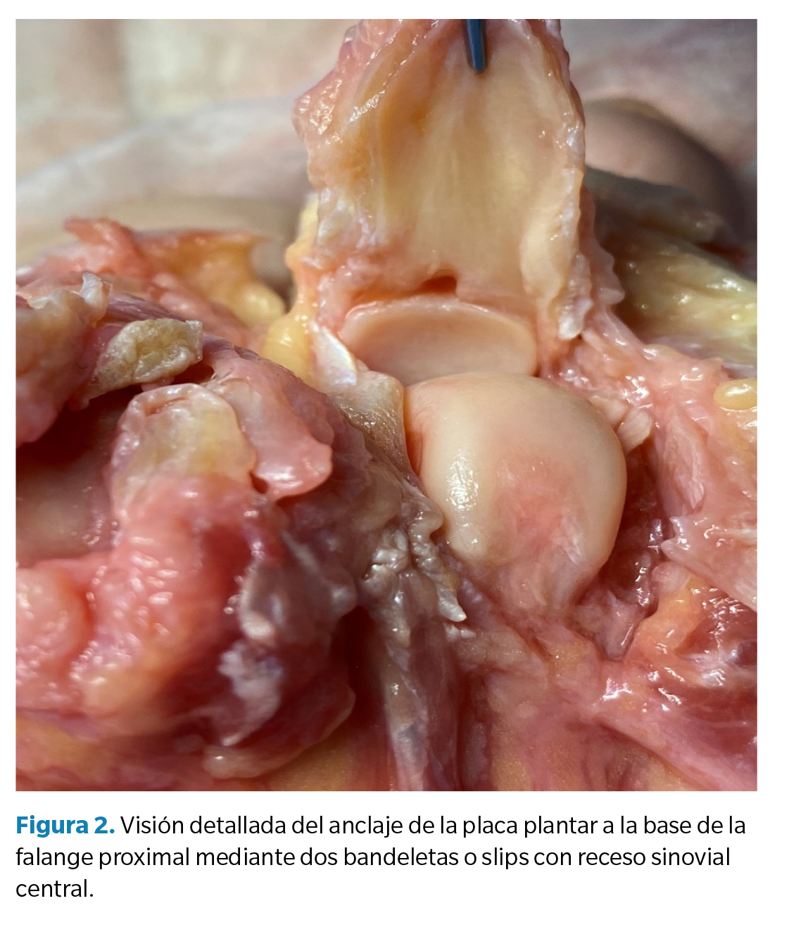 • Anclaje distal a la base de la falange proximal: su inserción a la zona plantar de la base de la falange proximal es fuerte y está compuesta de una mayor proporción de fibroblastos, constituyendo un tejido de características ligamentosas(4). Todo el grosor de la estructura se inserta en el hueso mediante dos bandeletas reforzadas, medial y lateral, y en continuidad con el cartílago constituyendo un habitáculo cóncavo para la cabeza metatarsal. En su zona central puede existir un pequeño receso sinovial central que, en ocasiones, se confunde con patología en imágenes de resonancia magnética (pseudorotura de la placa plantar) (5) (Figura 2).