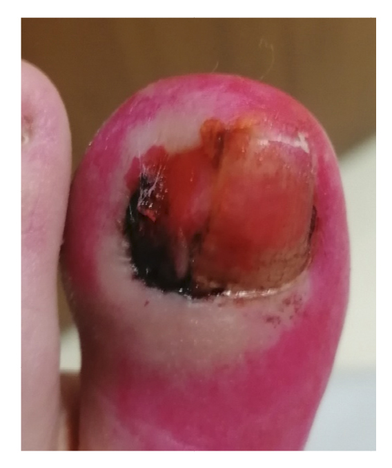 Tras empeoramiento del cuadro clínico, el 14 de noviembre de 2022 se realiza en su centro de salud la retirada parcial de la placa ungueal lateral del pie izquierdo junto con raspado, retirando tejido hiperqueratósico y de granulación. El procedimiento es repetido 48 h más tarde (16 de noviembre de 2022) por no haber retirado toda la lesión (Figura 3), cambiando el tratamiento antibiótico a anaclosil 500 mg 1/6 h y posteriormente a ciprofloxacino 500 mg 1/12 h durante las siguientes semanas.