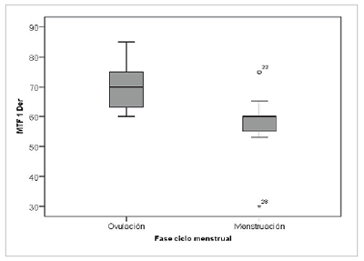 En la Tabla I se presentan los estadísticos descriptivos y las pruebas de rango con signo de Wilcoxon para comparar el rango articular en la pierna derecha. Los valores de flexión dorsal del tobillo con la rodilla extendida y flexionada, y de extensión de la 1.ª articulación metatarsofalángica del 1.er dedo son superiores durante la fase de ovulación (Figuras 4 a 6).