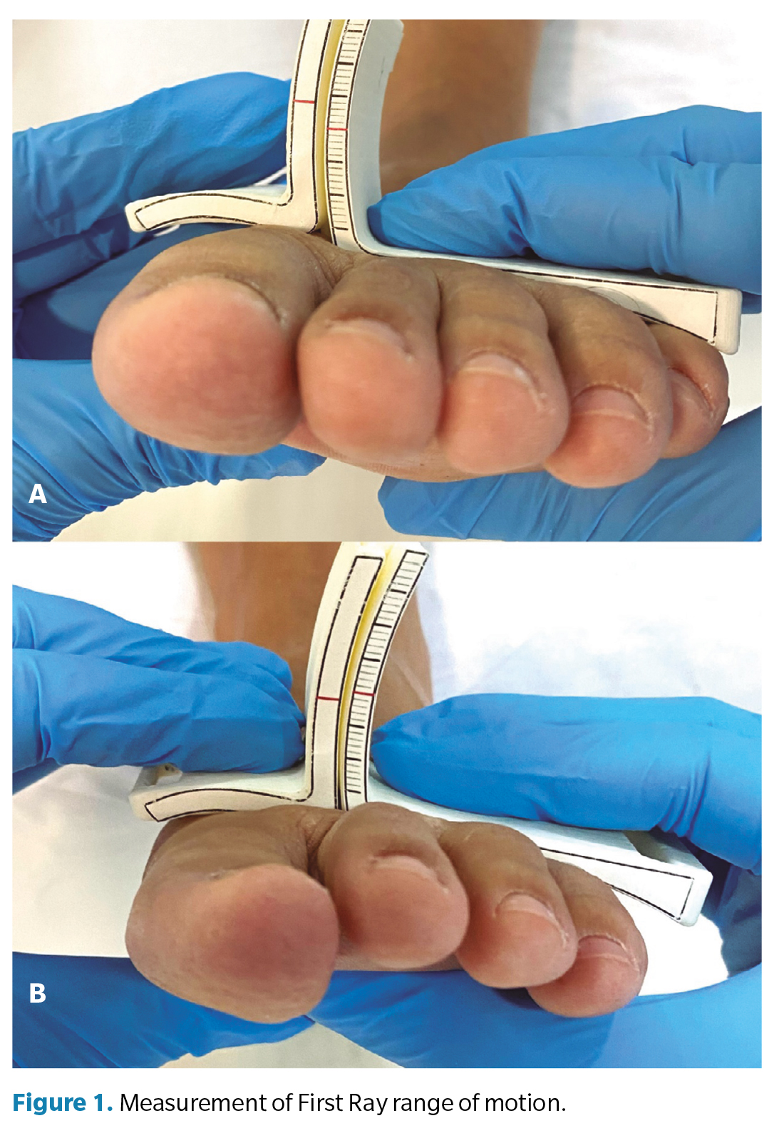 The clinical examination of all subjects was performed by a podiatrist with more than 10 years of experience. First, to determine whether participants had the study condition, i.e., flexible dorsiflexed first ray, maximum dorsiflexion / plantarflexion of the first ray was assessed. To do this, the subject was placed on a examination table in a supine position with the ankle relaxed and the subtalar joint in a neutral position. Afterwards, the mobility of the first ray was measured with a measuring instrument(20) to register the range of motion in millimeters of maximum dorsiflexion , following the protocol previously described in other research works(20,21,22) The head of the first metatarsal was moved upward to its maximum range in dorsiflexion (Figure 1A) and was subsequently moved downward to its maximum range in plantarflexion (Figure 1B). The range of motion was determined by observing on the instrument‘s ruler how many millimeters it moved in both positions.