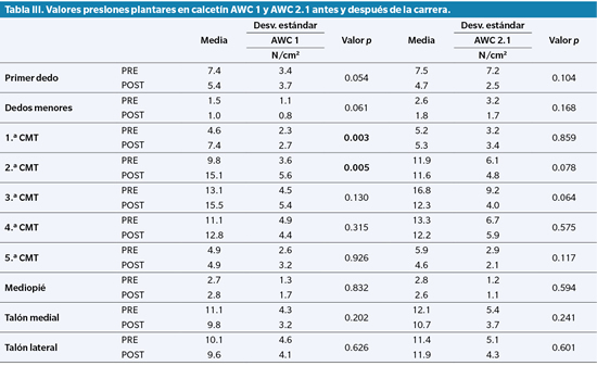 En el mismo tipo de calcetín (AWC 1), antes y después de correr 10 kilómetros, las mayores presiones plantares se encontraron en el tercer metatarsiano con 13.1 ± 4.5 N/cm2 antes y 15.5 ± 5.4 N/cm2 tras la carrera, seguido del segundo metatarsiano con de 9,8 ± antes y 15,1 ± después de correr. Los valores más bajos de presión plantar se encontraron en la zona del medio pie y los dedos menores (Tabla III).