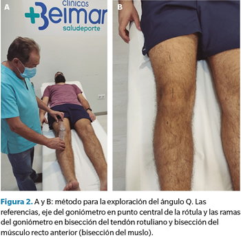 Por su parte, Chassaing y cols.6 proponen que la torsión lateral de la tuberosidad anterior de la tibia, marcador de la propia torsión que experimenta el hueso, es un factor relacionado directamente con la inestabilidad rotuliana y lateralización de la misma. Obteniendo valores que demuestran una correlación excelente entre las distintas variables que determinan esta conclusión (la lateralización y localización de la rótula y tuberosidad anterior de la tibia se determinó con RMN con diferentes técnicas validadas). En este sentido, en la exploración clínica de biomecánica medimos el ángulo Q, que es la expresión clínica referida en el artículo anteriormente referenciado, de gran utilidad en el estudio de la las tendinopatías del tendón rotuliano o la relación que presenta este ángulo cuando está incrementado con la condromalacia rotuliana en el polo superior externo de la rótula (Figura 2).