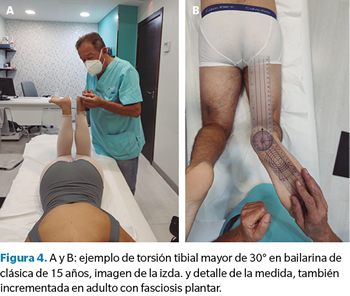 Otras observaciones en las que la torsión tibial puede ser síntoma de patologías o consecuencia de estas, podrían tener su origen en ciertas prácticas deportivas que incentivan la rotación externa de las extremidades. El fútbol es un ejemplo de ello, ya que la mayoría de los futbolistas presentan un menor patrón rotador interno, provocando un aumento de la torsión tibial externa. La gimnasia rítmica y la danza clásica son dos ejemplos claros en los que encontramos rangos de patrón rotador interno muy limitados y las torsiones tibiales externas con valores mayores a 30° en la mayoría de los casos (Figura 4).