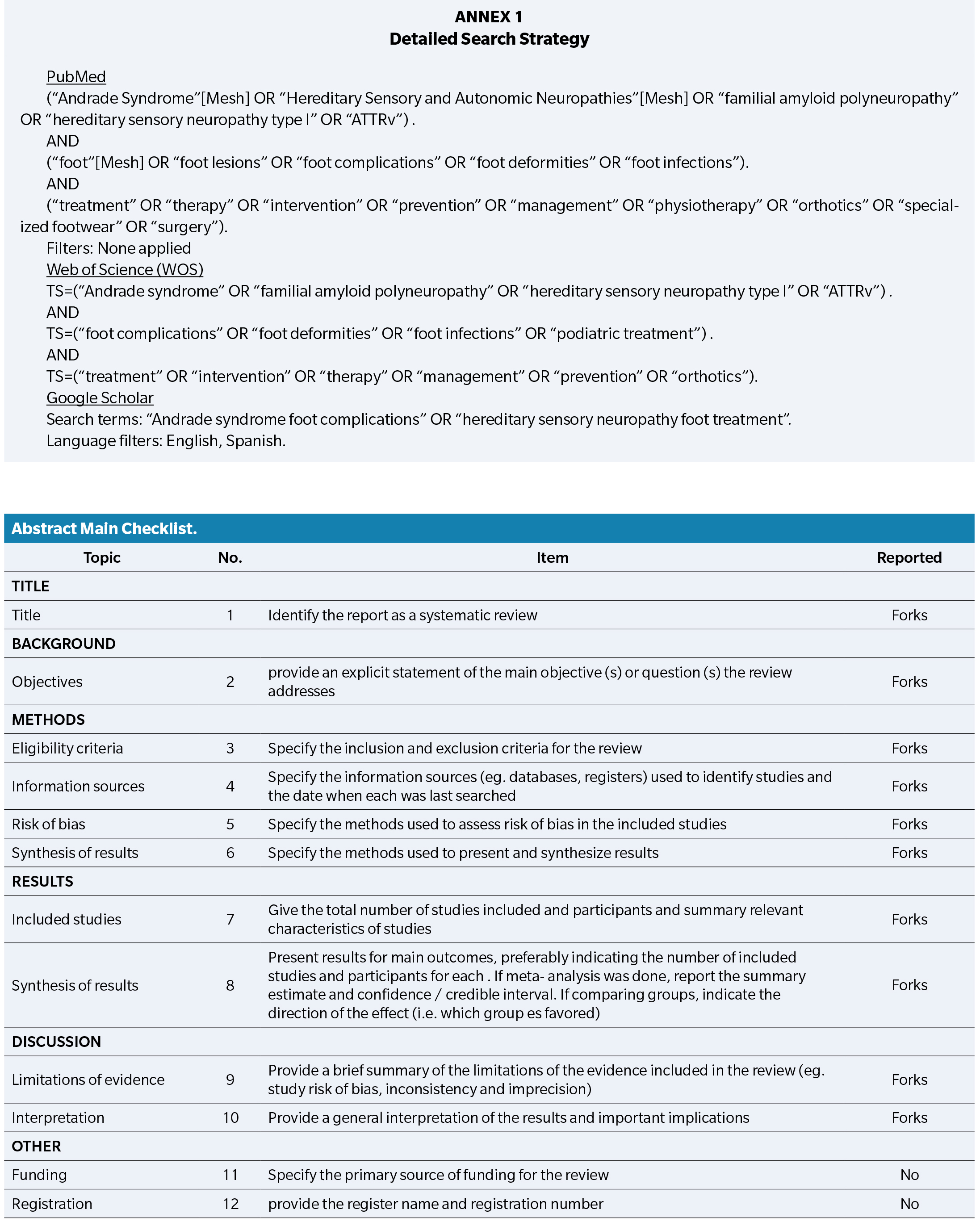 Following keywords: “Andrade syndrome”, “Hereditary sensory neuropathy type I”, “foot lesions”, “foot complications”, “foot deformities”, “foot infections”, “treatment”, “therapy”, “management”, “intervention”, “prevention”, “specialized footwear”, “physiotherapy”, “surgery”, “orthotics”, “medications”.