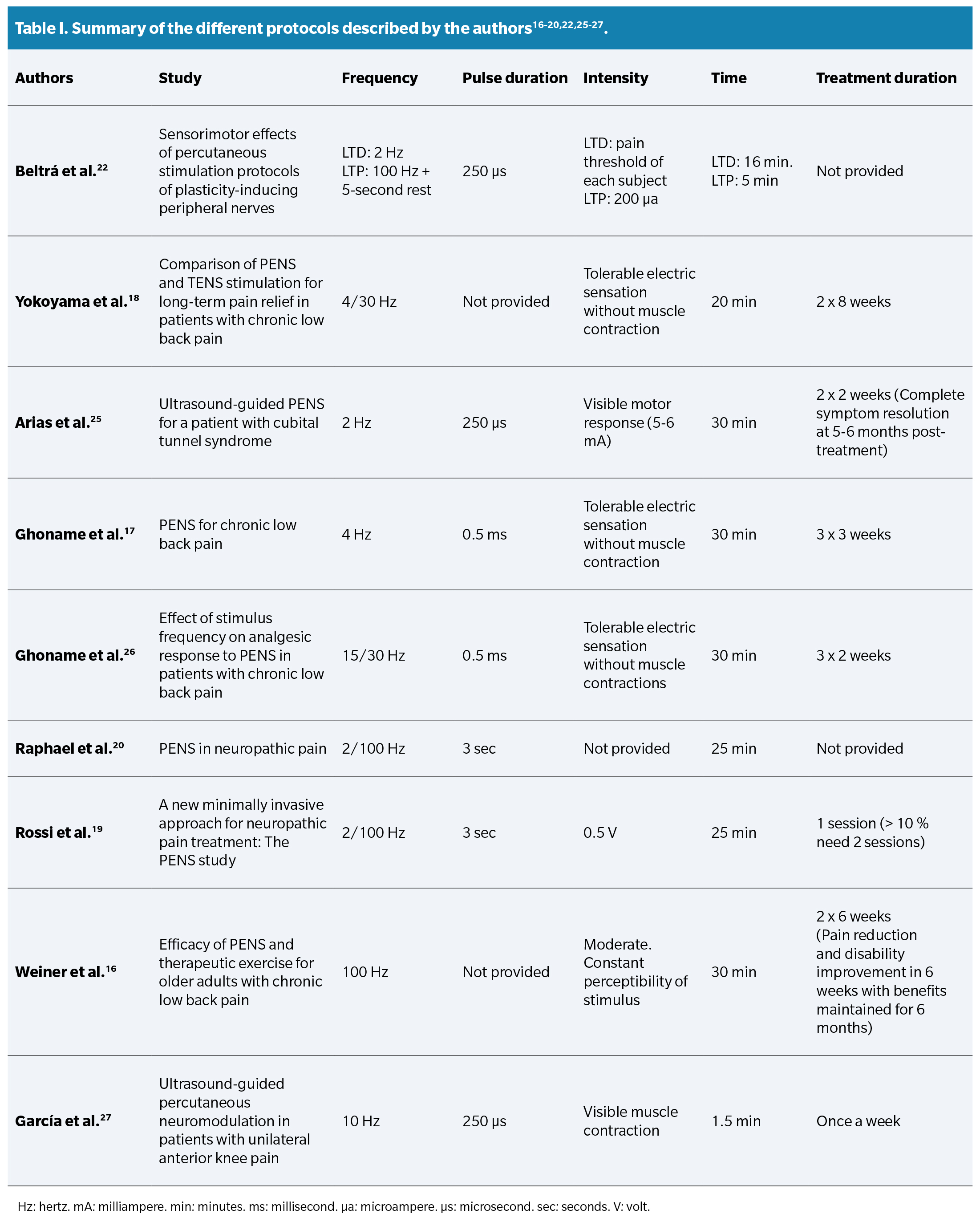 In 2020, García et al. (27) conducted a randomized clinical trial to investigate the short-term effects of PENS technique by applying it to the femoral nerve in patients with nonspecific anterior knee pain, considering it could be due to nerve entrapment, among other hypotheses. The results indicated improvements in the patients’ pain, functionality, and range of motion for one week after a single stimulation. The authors suggest applying this therapy weekly, although they do not specify the total duration of the treatment.