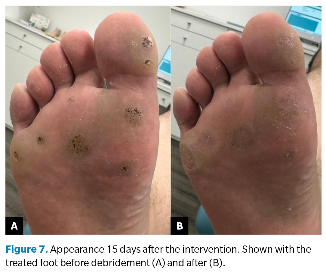 A change in the appearance of the lesions is noted, with the wounds appearing much drier vs 48 hours post-treatment. At this stage, the lesions can be debrided without any issues. Hyperkeratosis was removed with a scalpel (including from the untreated contralateral foot, which showed apparent improvement, as seen in Figures 7 and 8).